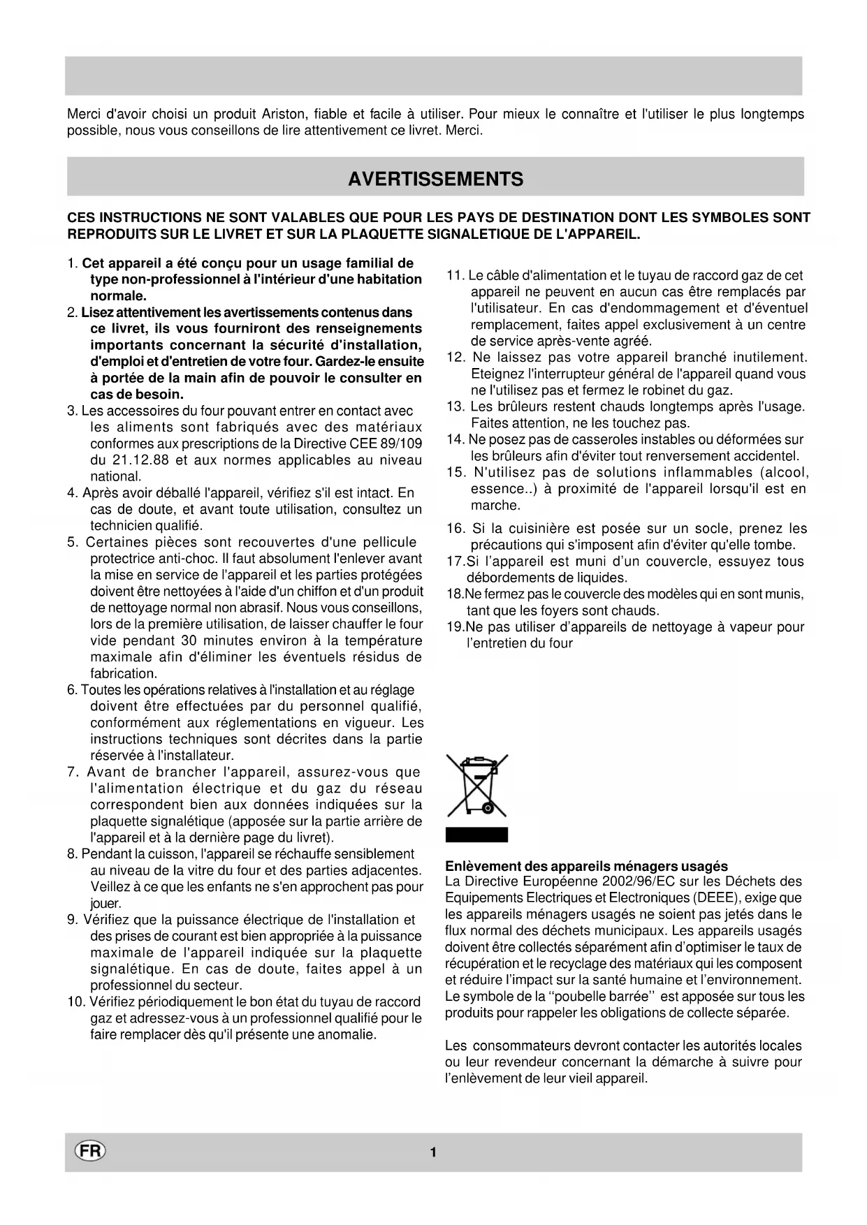 gaz et adressez-vous à un professionnel qualifié pour le faire remplacer dès qu'il présente une anomalie. AVERTISSEMENTS CES INSTRUCTIONS NE SONT VALABLES QUE POUR LES PAYS DE DESTINATION DONT LES SYMBOLES SONT REPRODUITS SUR LE LIVRET ET SUR LA PLAQUETTE SIGNALETIQUE DE L'APPAREIL. Merci d'avoir choisi un produit Ariston, fiable et facile à utiliser. Pour mieux le connaître et l'utiliser le plus longtemps possible, nous vous conseillons de lire attentivement ce livret. Merci.