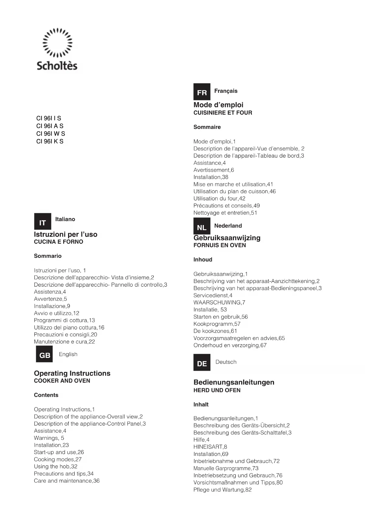 CI 96I I S - Cuisinière SCHOLTES - Notice d'utilisation et mode d'emploi gratuit