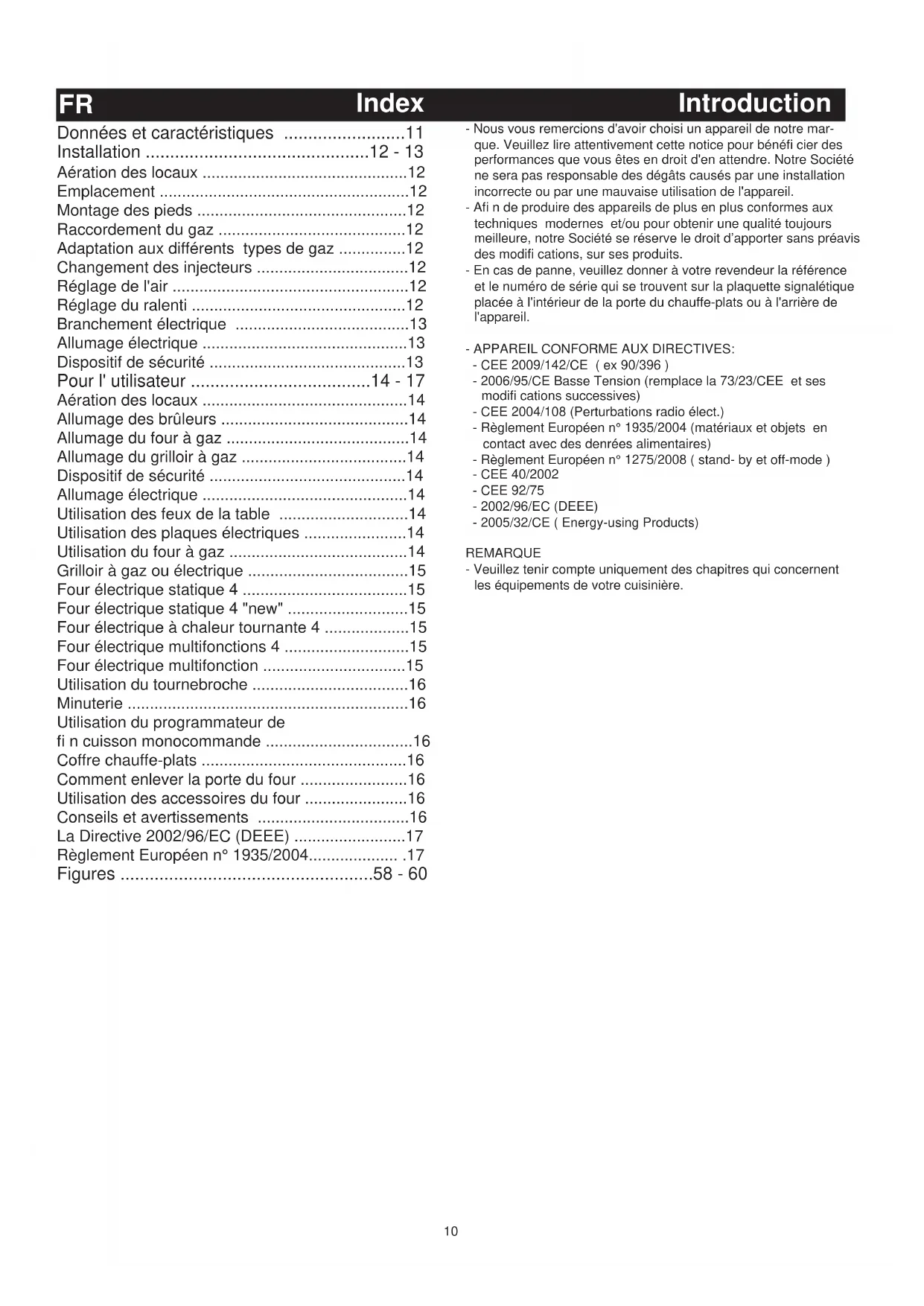 - Nous vous remercions d'avoir choisi un appareil de notre mar- que. Veuillez lire attentivement cette notice pour bénéfi cier des performances que vous êtes en droit d'en attendre. Notre Société ne sera pas responsable des dégâts causés par une installation incorrecte ou par une mauvaise utilisation de l'appareil. - Afi n de produire des appareils de plus en plus conformes aux techniques modernes et/ou pour obtenir une qualité toujours meilleure, notre Société se réserve le droit d’apporter sans préavis des modifi cations, sur ses produits. - En cas de panne, veuillez donner à votre revendeur la référence et le numéro de série qui se trouvent sur la plaquette signalétique placée à l'intérieur de la porte du chauffe-plats ou à l'arrière de l'appareil. - APPAREIL CONFORME AUX DIRECTIVES: - CEE 2009/142/CE ( ex 90/396 ) - 2006/95/CE Basse Tension (remplace la 73/23/CEE et ses modifi cations successives) - CEE 2004/108 (Perturbations radio élect.) - Règlement Européen n° 1935/2004 (matériaux et objets en contact avec des denrées alimentaires) - Règlement Européen n° 1275/2008 ( stand- by et off-mode ) - CEE 40/2002 - CEE 92/75 - 2002/96/EC (DEEE) - 2005/32/CE ( Energy-using Products) REMARQUE - Veuillez tenir compte uniquement des chapitres qui concernent les équipements de votre cuisinière. Introduction11 Données et caractéristiques techniques