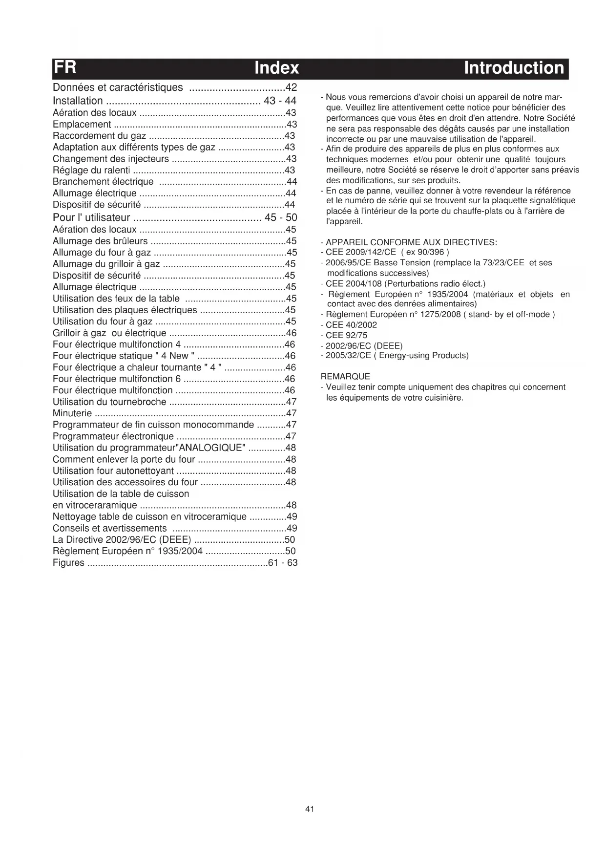 - Figures - 63 - Nous vous remercions d'avoir choisi un appareil de notre mar- que. Veuillez lire attentivement cette notice pour bénéficier des performances que vous êtes en droit d'en attendre. Notre Société ne sera pas responsable des dégâts causés par une installation incorrecte ou par une mauvaise utilisation de l'appareil. - Afin de produire des appareils de plus en plus conformes aux techniques modernes et/ou pour obtenir une qualité toujours meilleure, notre Société se réserve le droit d’apporter sans préavis des modifications, sur ses produits. - En cas de panne, veuillez donner à votre revendeur la référence et le numéro de série qui se trouvent sur la plaquette signalétique placée à l'intérieur de la porte du chauffe-plats ou à l'arrière de l'appareil. - APPAREIL CONFORME AUX DIRECTIVES: - CEE 2009/142/CE ( ex 90/396 ) - 2006/95/CE Basse Tension (remplace la 73/23/CEE et ses modifications successives) - CEE 2004/108 (Perturbations radio élect.) - Règlement Européen n° 1935/2004 (matériaux et objets en contact avec des denrées alimentaires) - Règlement Européen n° 1275/2008 ( stand- by et off-mode ) - CEE 40/2002 - CEE 92/75 - 2002/96/EC (DEEE) - 2005/32/CE ( Energy-using Products) REMARQUE - Veuillez tenir compte uniquement des chapitres qui concernent les équipements de votre cuisinière.42 p. 61
