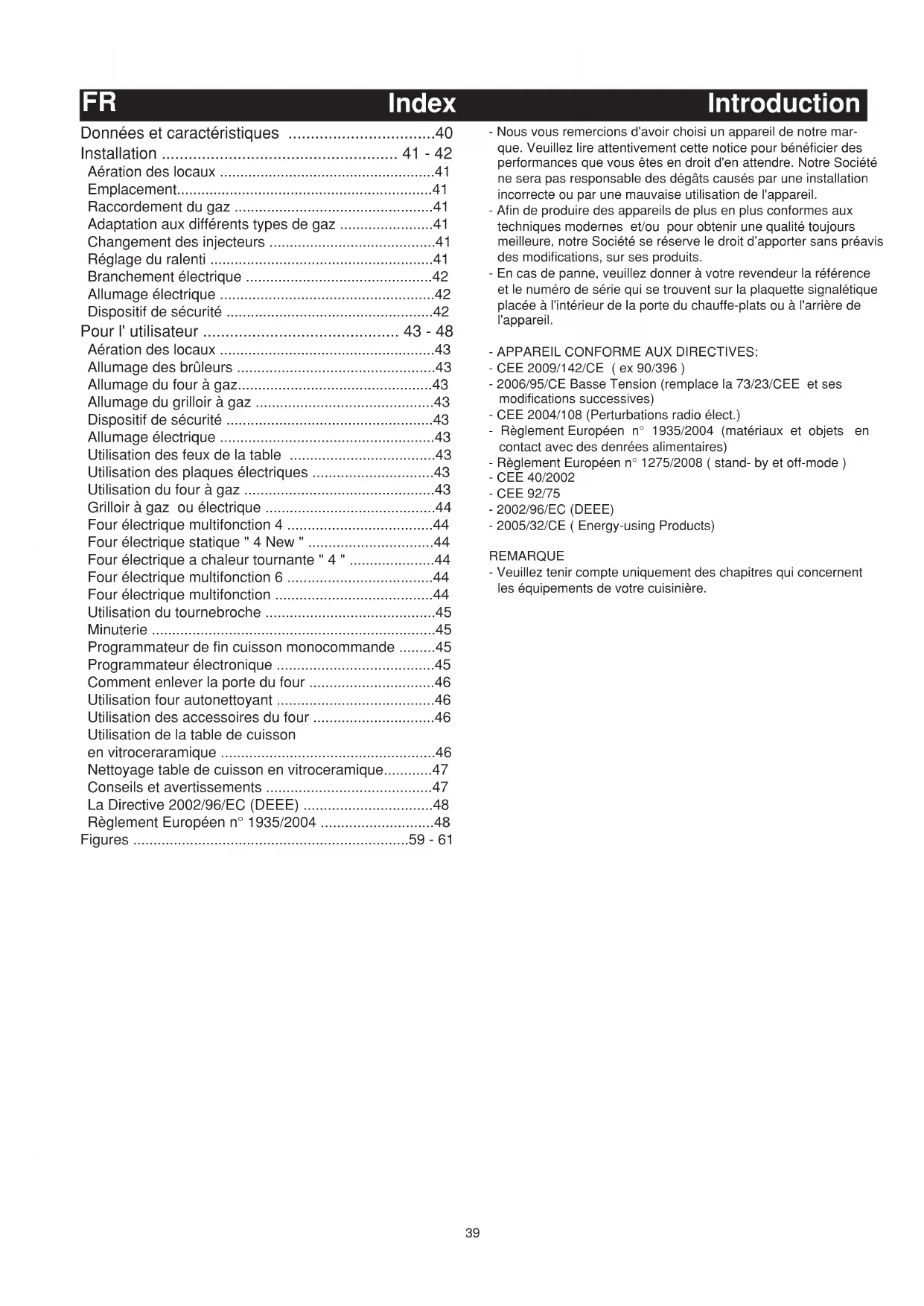 - Figures - 61 - Nous vous remercions d'avoir choisi un appareil de notre mar- que. Veuillez lire attentivement cette notice pour bénéficier des performances que vous êtes en droit d'en attendre. Notre Société ne sera pas responsable des dégâts causés par une installation incorrecte ou par une mauvaise utilisation de l'appareil. - Afin de produire des appareils de plus en plus conformes aux techniques modernes et/ou pour obtenir une qualité toujours meilleure, notre Société se réserve le droit d’apporter sans préavis des modifications, sur ses produits. - En cas de panne, veuillez donner à votre revendeur la référence et le numéro de série qui se trouvent sur la plaquette signalétique placée à l'intérieur de la porte du chauffe-plats ou à l'arrière de l'appareil. - APPAREIL CONFORME AUX DIRECTIVES: - CEE 2009/142/CE ( ex 90/396 ) - 2006/95/CE Basse Tension (remplace la 73/23/CEE et ses modifications successives) - CEE 2004/108 (Perturbations radio élect.) - Règlement Européen n° 1935/2004 (matériaux et objets en contact avec des denrées alimentaires) - Règlement Européen n° 1275/2008 ( stand- by et off-mode ) - CEE 40/2002 - CEE 92/75 - 2002/96/EC (DEEE) - 2005/32/CE ( Energy-using Products) REMARQUE - Veuillez tenir compte uniquement des chapitres qui concernent les équipements de votre cuisinière.40 p. 59