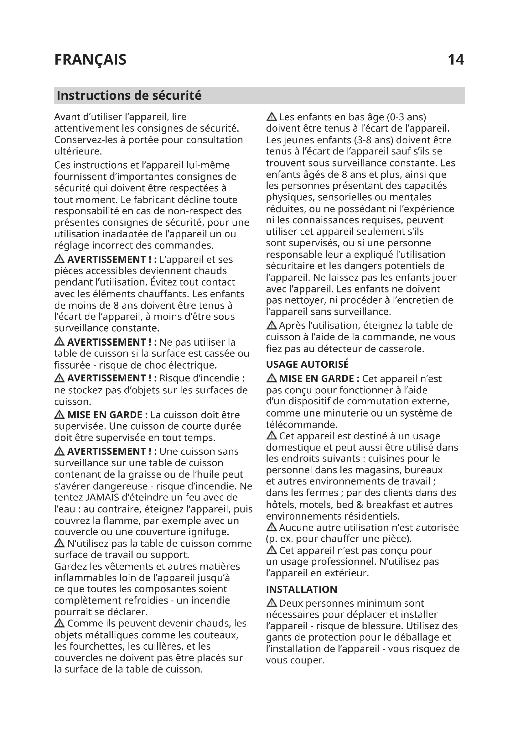 DEUTSCH14 Instructions de sécurité FRANÇAIS Avant d’utiliser l’appareil, lire attentivement les consignes de sécurité. Conservez-les à portée pour consultation ultérieure. Ces instructions et l’appareil lui-même fournissent d’importantes consignes de sécurité qui doivent être respectées à tout moment. Le fabricant décline toute responsabilité en cas de non-respect des présentes consignes de sécurité, pour une utilisation inadaptée de l’appareil un ou réglage incorrect des commandes. AVERTISSEMENT ! : L’appareil et ses pièces accessibles deviennent chauds pendant l’utilisation. Évitez tout contact avec les éléments chauants. Les enfants de moins de 8ans doivent être tenus à l’écart de l’appareil, à moins d’être sous surveillance constante. AVERTISSEMENT ! : Ne pas utiliser la table de cuisson si la surface est cassée ou ssurée- risque de choc électrique. AVERTISSEMENT ! : Risque d’incendie : ne stockez pas d’objets sur les surfaces de cuisson. MISE EN GARDE : La cuisson doit être supervisée. Une cuisson de courte durée doit être supervisée en tout temps. AVERTISSEMENT ! : Une cuisson sans surveillance sur une table de cuisson contenant de la graisse ou de l’huile peut s’avérer dangereuse - risque d’incendie. Ne tentez JAMAIS d’éteindre un feu avec de l’eau : au contraire, éteignez l’appareil, puis couvrez la amme, par exemple avec un couvercle ou une couverture ignifuge. N’utilisez pas la table de cuisson comme surface de travail ou support. Gardez les vêtements et autres matières inammables loin de l’appareil jusqu’à ce que toutes les composantes soient complètement refroidies - un incendie pourrait se déclarer. Comme ils peuvent devenir chauds, les objets métalliques comme les couteaux, les fourchettes, les cuillères, et les couvercles ne doivent pas être placés sur la surface de la table de cuisson. Les enfants en bas âge (0-3 ans) doivent être tenus à l’écart de l’appareil. Les jeunes enfants (3-8 ans) doivent être tenus à l’écart de l’appareil sauf s’ils se trouvent sous surveillance constante. Les enfants âgés de 8 ans et plus, ainsi que les personnes présentant des capacités physiques, sensorielles ou mentales réduites, ou ne possédant ni l’expérience ni les connaissances requises, peuvent utiliser cet appareil seulement s’ils sont supervisés, ou si une personne responsable leur a expliqué l’utilisation sécuritaire et les dangers potentiels de l’appareil. Ne laissez pas les enfants jouer avec l’appareil. Les enfants ne doivent pas nettoyer, ni procéder à l’entretien de l’appareil sans surveillance. Après l’utilisation, éteignez la table de cuisson à l’aide de la commande, ne vous ez pas au détecteur de casserole. USAGE AUTORISÉ MISE EN GARDE : Cet appareil n’est pas conçu pour fonctionner à l’aide d’un dispositif de commutation externe, comme une minuterie ou un système de télécommande. Cet appareil est destiné à un usage domestique et peut aussi être utilisé dans les endroits suivants : cuisines pour le personnel dans les magasins, bureaux et autres environnements de travail; dans les fermes ; par des clients dans des hôtels, motels, bed & breakfast et autres environnements résidentiels. Aucune autre utilisation n’est autorisée (p. ex. pour chauer une pièce). Cet appareil n’est pas conçu pour un usage professionnel. N’utilisez pas l’appareil en extérieur. INSTALLATION Deux personnes minimum sont nécessaires pour déplacer et installer l’appareil - risque de blessure. Utilisez des gants de protection pour le déballage et l’installation de l’appareil - vous risquez de vous couper.15FRANÇAIS L’installation, incluant l’alimentation en eau (selon le modèle), et les connexions électriques, ainsi que les réparations, doivent être exécutées par un technicien qualié. Ne pas réparer ou remplacer de parties de l’appareil sauf si cela est spéciquement indiqué dans le manuel de l’utilisateur. Maintenir les enfants éloignés du site d’installation. Après avoir déballé l’appareil, assurez-vous qu’il n’a pas été endommagé pendant le transport. En cas de problèmes, contactez le distributeur ou votre service après-vente le plus proche. Une fois installé, les déchets de l’emballage (plastiques, pièces en polystyrène, etc) doivent être stockés hors de portée des enfants - risque d’étouement. L’appareil doit être débranché de l’alimentation électrique avant toute opération d’installation - risque de choc électrique. Pendant l’installation, assurez-vous que l’appareil n’endommage pas le câble électrique - risque d’incendie ou de choc électrique. Allumez l’appareil uniquement lorsque l’installation est terminée. Découper le contour du meuble avant d’y insérer l’appareil, et enlever soigneusement les copeaux et la sciure de bois. Si l’appareil n’est pas installé au- dessus d’un four, un panneau séparateur (non compris) doit être installé dans le compartiment sous l’appareil. AVERTISSEMENTS ÉLECTRIQUES Il doit être possible de débrancher l’appareil de l’alimentation électrique en retirant la che de la prise de courant si elle est accessible ou à l’aide d’un interrupteur multipolaire en amont de la prise de courant, conformément aux normes de sécurité électrique nationales. N’utilisez pas de rallonge, de prises multiples ou d’adaptateurs. Les composants électriques ne doivent pas être accessibles à l’utilisateur après l’installation. N’utilisez pas l’appareil lorsque vous êtes mouillés ou pieds nus. Ne faites pas fonctionner cet appareil s’il présente un câble ou une prise électrique endommagés, s’il ne fonctionne pas correctement ou s’il a été endommagé ou s’il est tombé. Si le câble d’alimentation est endommagé, il doit être remplacé par un câble identique par le fabricant, un 
