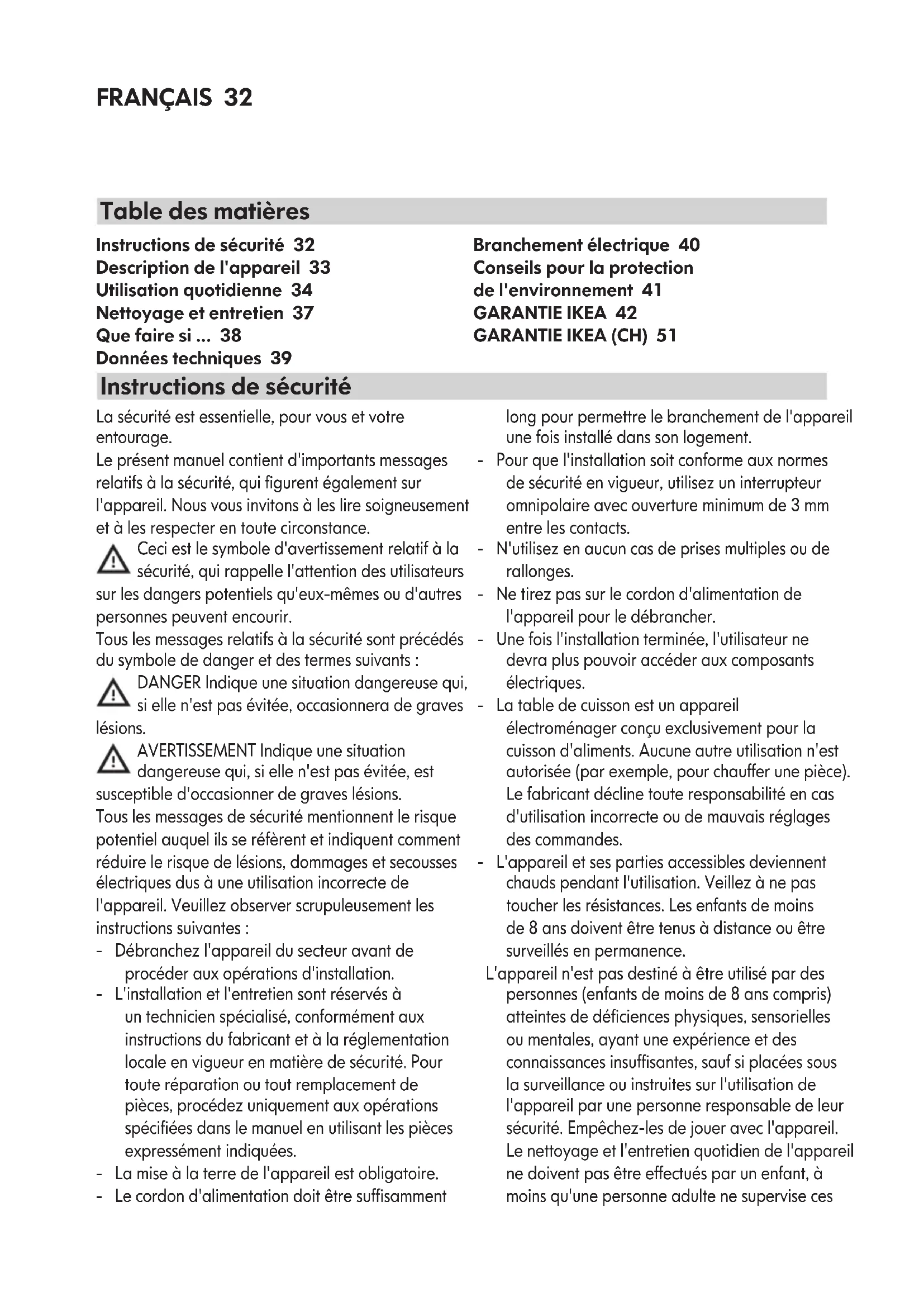 - Wenn Sie Fragen zu den Funktionen Ihres IKEA-Gerätes haben. Um Ihnen möglichst schnell und kompetent weiterhelfen zu können, bitten wir Sie, vorher die Montage und Gebrauchsanweisung Ihres Gerätes genauestens durchzulesen. So erreichen Sie unseren Service Gehen Sie dazu auf die letzte Seite dieser Broschüre. Dort nden Sie eine Übersicht mit den entsprechenden Telefonnummern und Kontaktdaten unserer autorisierten Kundendienste.DEUTSCH 31 Damit wir Ihnen im Falle einer Störung jederzeit schnell und kompetent helfen können, bitten wir Sie, sich an die in diesem Handbuch angegebene Service-Rufnummer zu wenden. Halten Sie dazu bitte die (8-stellige) IKEA Artikelnummer und die 12-stellige Servicenummer (auf dem Geräte-Typschild vermerkt) Ihres IKEA Gerätes bereit. KAUF-/AUSLIEFERUNGSBELEG AUF! Unser Service kann einen Garantieanspruch nur unter Vorlage dieses Beleges akzeptieren. Auf dem Beleg sind auch die Bezeichnung und (8-stellige) IKEA Artikelnummer des von Ihnen erworbenen Geräts vermerkt. Benötigen Sie weiteren Rat und Unterstützung? Bei allen anderen, nicht kundendienstspezischen Fragen bitten wir Sie, sich an den Kundenservice im nächstgelegenen IKEA-Einrichtungshaus zu wenden. Wir empfehlen Ihnen, vorher die dem Gerät beigefügten Unterlagen genauestens durchzulesen.FRANÇAIS 32 La sécurité est essentielle, pour vous et votre entourage. Le présent manuel contient d'importants messages relatifs à la sécurité, qui gurent également sur l'appareil. Nous vous invitons à les lire soigneusement et à les respecter en toute circonstance. Ceci est le symbole d'avertissement relatif à la sécurité, qui rappelle l'attention des utilisateurs sur les dangers potentiels qu'eux-mêmes ou d'autres personnes peuvent encourir. Tous les messages relatifs à la sécurité sont précédés du symbole de danger et des termes suivants : DANGER Indique une situation dangereuse qui, si elle n'est pas évitée, occasionnera de graves lésions. AVERTISSEMENT Indique une situation dangereuse qui, si elle n'est pas évitée, est susceptible d'occasionner de graves lésions. Tous les messages de sécurité mentionnent le risque potentiel auquel ils se réfèrent et indiquent comment réduire le risque de lésions, dommages et secousses électriques dus à une utilisation incorrecte de l'appareil. Veuillez observer scrupuleusement les instructions suivantes : - Débranchez l'appareil du secteur avant de procéder aux opérations d'installation. - L'installation et l'entretien sont réservés à un technicien spécialisé, conformément aux instructions du fabricant et à la réglementation locale en vigueur en matière de sécurité. Pour toute réparation ou tout remplacement de pièces, procédez uniquement aux opérations spéciées dans le manuel en utilisant les pièces expressément indiquées. - La mise à la terre de l'appareil est obligatoire. - Le cordon d'alimentation doit être sufsamment long pour permettre le branchement de l'appareil une fois installé dans son logement. - Pour que l'installation soit conforme aux normes de sécurité en vigueur, utilisez un interrupteur omnipolaire avec ouverture minimum de 3 mm entre les contacts. - N'utilisez en aucun cas de prises multiples ou de rallonges. - Ne tirez pas sur le cordon d'alimentation de l'appareil pour le débrancher. - Une fois l'installation terminée, l'utilisateur ne devra plus pouvoir accéder aux composants électriques. - La table de cuisson est un appareil électroménager conçu exclusivement pour la cuisson d'aliments. Aucune autre utilisation n'est autorisée (par exemple, pour chauffer une pièce). Le fabricant décline toute responsabilité en cas d'utilisation incorrecte ou de mauvais réglages des commandes. - L'appareil et ses parties accessibles deviennent chauds pendant l'utilisation. Veillez à ne pas toucher les résistances. Les enfants de moins de 8 ans doivent être tenus à distance ou être surveillés en permanence. L'appareil n'est pas destiné à être utilisé par des personnes (enfants de moins de 8 ans compris) atteintes de déciences physiques, sensorielles ou mentales, ayant une expérience et des connaissances insufsantes, sauf si placées sous la surveillance ou instruites sur l'utilisation de l'appareil par une personne responsable de leur sécurité. Empêchez-les de jouer avec l'appareil. Le nettoyage et l'entretien quotidien de l'appareil ne doivent pas être effectués par un enfant, à moins qu'une personne adulte ne supervise ces Instructions de sécurité Table des matières Instructions de sécurité 32 Description de l'appareil 33 Utilisation quotidienne 34 Nettoyage et entretien 37 Que faire si ... 38 Données techniques 39 Branchement électrique 40 Conseils pour la protection de l'environnement 41 GARANTIE IKEA 42