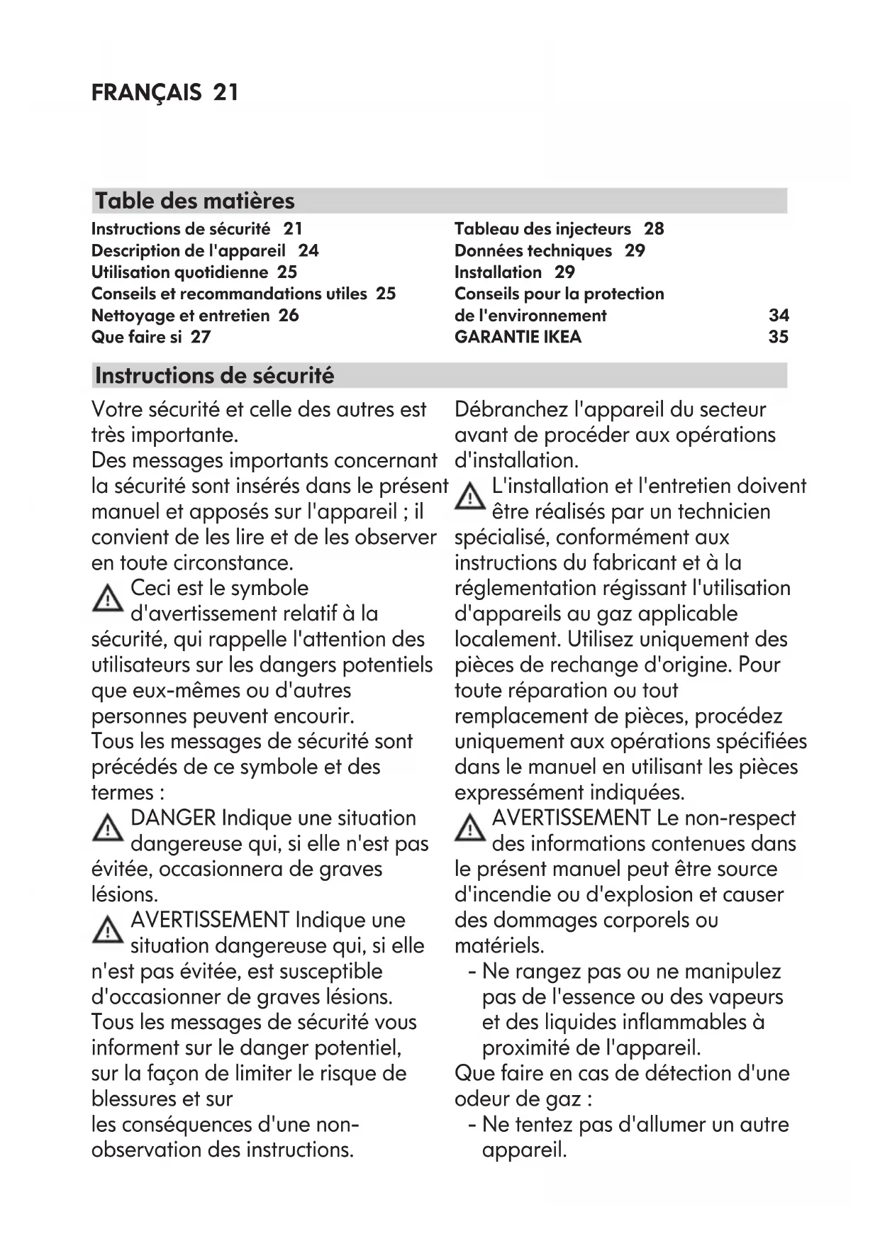 GUT AUF! Unser Service kann einen Garantieanspruch nur unter Vorlage dieses Beleges akzeptieren. Auf dem Kaufbeleg ist auch die IKEA Bezeichnung und Artikelnummer (8-stelliger Code) für jedes der Geräte, die Sie gekauft haben, vermerkt. Benötigen Sie weiteren Rat und Unterstützung? Bei allen anderen, nicht kundendienstspezischen Fragen, bitten wir Sie, sich an Ihr nächstgelegenes IKEA- Einrichtungshaus zu wenden. Wir empfehlen Ihnen, sich vorher die dem Gerät beigefügten Unterlagen genauestens durchzulesen.FRANÇAIS 21 Votre sécurité et celle des autres est très importante. Des messages importants concernant la sécurité sont insérés dans le présent manuel et apposés sur l'appareil ; il convient de les lire et de les observer en toute circonstance. Ceci est le symbole d'avertissement relatif à la sécurité, qui rappelle l'attention des utilisateurs sur les dangers potentiels que eux-mêmes ou d'autres personnes peuvent encourir. Tous les messages de sécurité sont précédés de ce symbole et des termes : DANGER Indique une situation dangereuse qui, si elle n'est pas évitée, occasionnera de graves lésions. AVERTISSEMENT Indique une situation dangereuse qui, si elle n'est pas évitée, est susceptible d'occasionner de graves lésions. Tous les messages de sécurité vous informent sur le danger potentiel, sur la façon de limiter le risque de blessures et sur les conséquences d'une non- observation des instructions. Débranchez l'appareil du secteur avant de procéder aux opérations d'installation. L'installation et l'entretien doivent être réalisés par un technicien spécialisé, conformément aux instructions du fabricant et à la réglementation régissant l'utilisation d'appareils au gaz applicable localement. Utilisez uniquement des pièces de rechange d'origine. Pour toute réparation ou tout remplacement de pièces, procédez uniquement aux opérations spéciées dans le manuel en utilisant les pièces expressément indiquées. AVERTISSEMENT Le non-respect des informations contenues dans le présent manuel peut être source d'incendie ou d'explosion et causer des dommages corporels ou matériels. - Ne rangez pas ou ne manipulez pas de l'essence ou des vapeurs et des liquides inammables à proximité de l'appareil. Que faire en cas de détection d'une odeur de gaz : - Ne tentez pas d'allumer un autre appareil. Instructions de sécurité 21 Description de l'appareil 24 Utilisation quotidienne 25 Conseils et recommandations utiles 25 Nettoyage et entretien 26 Que faire si 27 Tableau des injecteurs 28 Données techniques 29 Installation 29 Conseils pour la protection de l'environnement 34 GARANTIE IKEA 35 Instructions de sécurité Table des matièresFRANÇAIS 22 - Ne touchez pas les interrupteurs électriques. - N'utilisez pas de téléphone à l'intérieur de l'habitation. - Appelez immédiatement votre fournisseur de gaz avec le téléphone d'un voisin. Suivez les instructions que celui-ci vous fournira. - Si votre fournisseur de gaz n'est pas joignable, appelez les pompiers. - L'installation et l'entretien doivent être effectués par un technicien qualié, un atelier d'entretien et de réparation ou par le fournisseur de gaz. - Utilisez l'appareil dans une pièce bien aérée. - Les branchements électriques et le raccordement au gaz doivent être réalisés conformément aux réglementations locales en vigueur. - Lors de l'installation, il faut prévoir un disjoncteur omnipolaire avec ouverture des contacts de 3 mm minimum assurant une déconnexion complète. - La mise à la terre de l'appareil est obligatoire. - Le cordon d'alimentation doit être sufsamment long pour permettre le branchement de l'appareil une fois installé dans son logement - Effectuez le raccordement au gaz à l'aide d'un exible ou d'un tuyau en métal rigide. - Si cela s'avère nécessaire, il convient de remplacer le cordon d'alimentation exclusivement par un cordon possédant les mêmes caractéristiques que celui d'origine fourni par le fabricant (type H05V2V2-F 90°C ou H05RR-F). Cette opération doit être réalisée par un électricien qualié. - Le fabricant décline toute responsabilité en cas de blessure causée à des personnes ou des animaux ou en cas de dommage matériel résultant du non-respect de ces consignes. - N'utilisez ni rallonge, ni adaptateur multiple. - Ne tirez pas sur le cordon d'alimentation de l'appareil pour le débrancher. - Une fois l'installation terminée, l'utilisateur ne devra plus pouvoir accéder aux composants électriques. - Évitez de toucher l'appareil avec les mains mouillées et lorsque vous êtes pieds nus. - Cette table de cuisson (Classe 3) est exclusivement conçue comme appareil de cuisson. N'utilisez jamais cet appareil pour chauffer une pièce. Il en résulterait un risque d'intoxication au monoxyde de carbone et une surchauffe de la table de cuisson. - Le fabricant décline toute responsabilité en cas d'utilisation incorrecte ou de mauvais réglages des commandes.FRANÇAIS 23 - L'appareil et ses parties accessibles deviennent chauds pendant l'utilisation. Veillez à ne pas toucher les résistances. Les enfants de moins de 8 ans doivent être tenus à distance ou être surveillés en permanence. L'appareil n'est pas destiné à être utilisé par des personnes (enfants de moins de 8 ans compris) atteintes de déciences physiques, sensorielles ou mentales, ayant une expérience et des connaissances insufsantes, sauf si placées sous la surveillance ou instruites sur l'utilisation de l'appareil par une personne responsable de leur sécurité. Empêchez-les de jouer avec l'appareil. Le nettoyage et l'entretien quotidien de l'appareil ne doivent pas être effectués par un enfant, à moins qu'une personne adulte ne supervise ces opérations. - L'utilisation d'un appareil à gaz produit de la chaleur et de l'humidité à l'intérieur de la pièce. Veillez à ce que la pièce soit aérée correctement ou installez une hotte aspirante dot