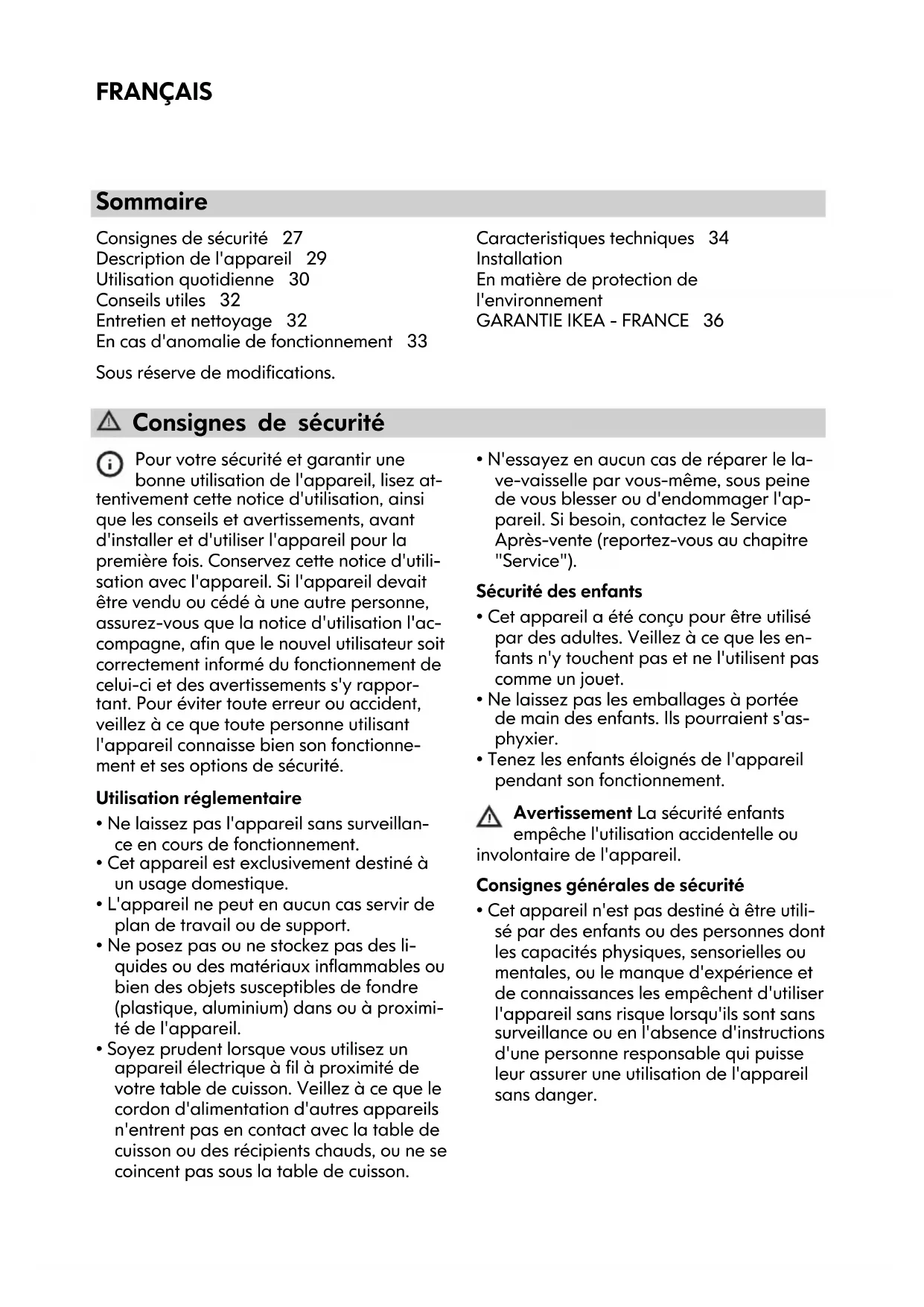 APRES-VENTE IKEA Décret n° 87-1045 relatif à la présentation des écrits constatant les contrats de garan- tie et de service après-vente (J.O.R.F. du 29 décembre 1987) Préalablement à la signa- ture du bon de commande, le vendeur indi- quera à l’acheteur les installations nécessai- res pour assurer le branchement de l’appa- reil selon les règles de l’art. Numéros de modèle et de série (Reporter ici le numéro d’identification porté sur l’éti- quette code barre du produit) Modèle : N° de série : Date d’achat (Reporter ici la date d’achat portée sur votre ticket de caisse) : Le vendeur est tenu de fournir une mar- chandise conforme à la commande. Livraison et mise en service Livraison à domicile : oui, si demandée par le client (selon modalités définies et men- tionnées sur la facture d'achat ou le bon de commande). Gratuite : non (tarif et modalités disponibles en magasin et fournis au client au moment de la commande ou de l’achat). Mise en service : non. En cas de défauts apparents ou d’absence de notice d’emploi et d’entretien, l’acheteur a intérêt à les faire constater par écrit par le vendeur ou le livreur lors de l’enlèvement de la livraison ou de la mise en service. Garantie Légale (sans supplément de prix) A la condition que l’acheteur fasse la pre- uve du défaut caché, le vendeur doit léga- lement en réparer toutes les conséquences (art.1641 et suivants du Code Civil). Si l’acheteur s’adresse aux tribunaux, il doit le faire dans un délai de deux ans à compter de la découverte du défaut caché (art.1648 du Code Civil). Nota - En cas de recherche de solutions amiables préalablement à toute action en justice, il est rappelé qu'elles n'interrompent pas le délai de prescription. La réparation des conséquences du défaut caché, lorsqu’il a été prouvé, comporte, se- lon la jurisprudence: FRANÇAIS 36• soit la réparation totalement gratuite de l'appareil, y compris les frais de main- d’œuvre et de déplacement au lieu de la mise en service ;