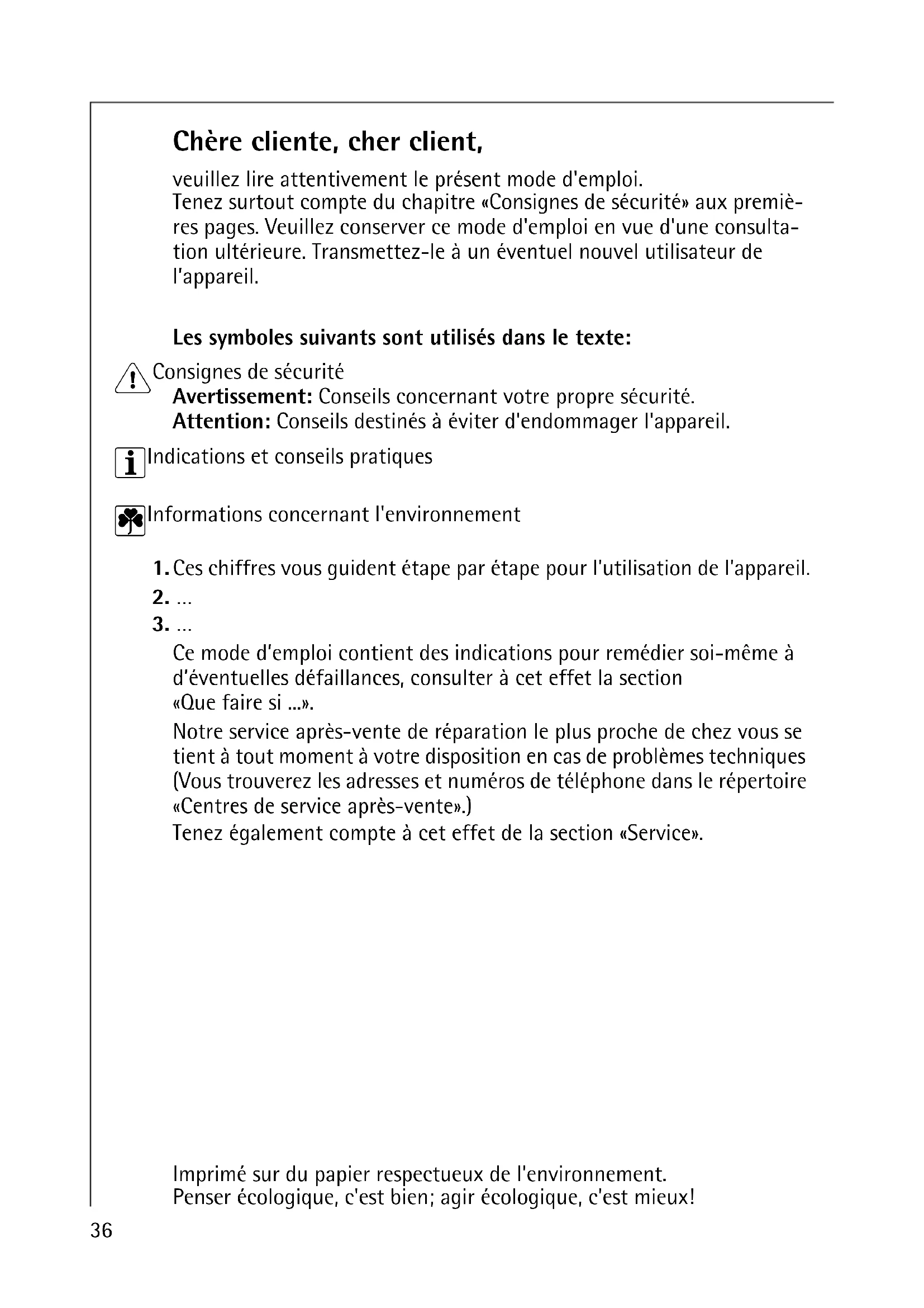 Tenez surtout compte du chapitre «Consignes de sécurité» aux premières pages. Veuillez conserver ce mode d'emploi en vue d'une consultation ultérieure. Transmettez-le à un éventuel nouvel utilisateur de l'appareil.