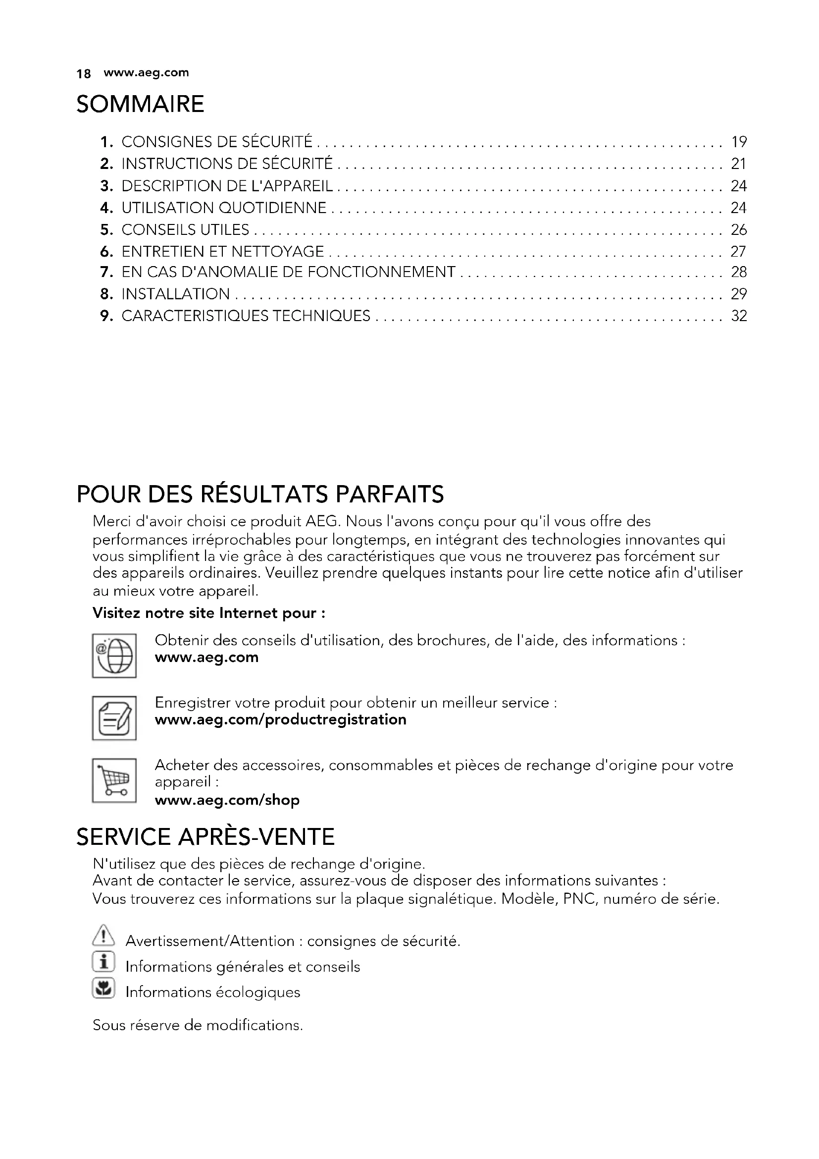 Merci d'avoir choisi ce produit AEG. Nous l'avons conçu pour qu'il vous offre des performances irréprochables pour longtemps, en intégrant des technologies innovantes qui vous simplifient la vie grâce à des caractéristiques que vous ne trouverez pas forcément sur des appareils ordinaires. Veuillez prendre quelques instants pour lire cette notice afin d'utiliser au mieux votre appareil. Visitez notre site Internet pour : Obtenir des conseils d'utilisation, des brochures, de l'aide, des informations : www.aeg.com Enregistrer votre produit pour obtenir un meilleur service : www.aeg.com/productregistration Acheter des accessoires, consommables et pièces de rechange d'origine pour votre appareil : www.aeg.com/shop