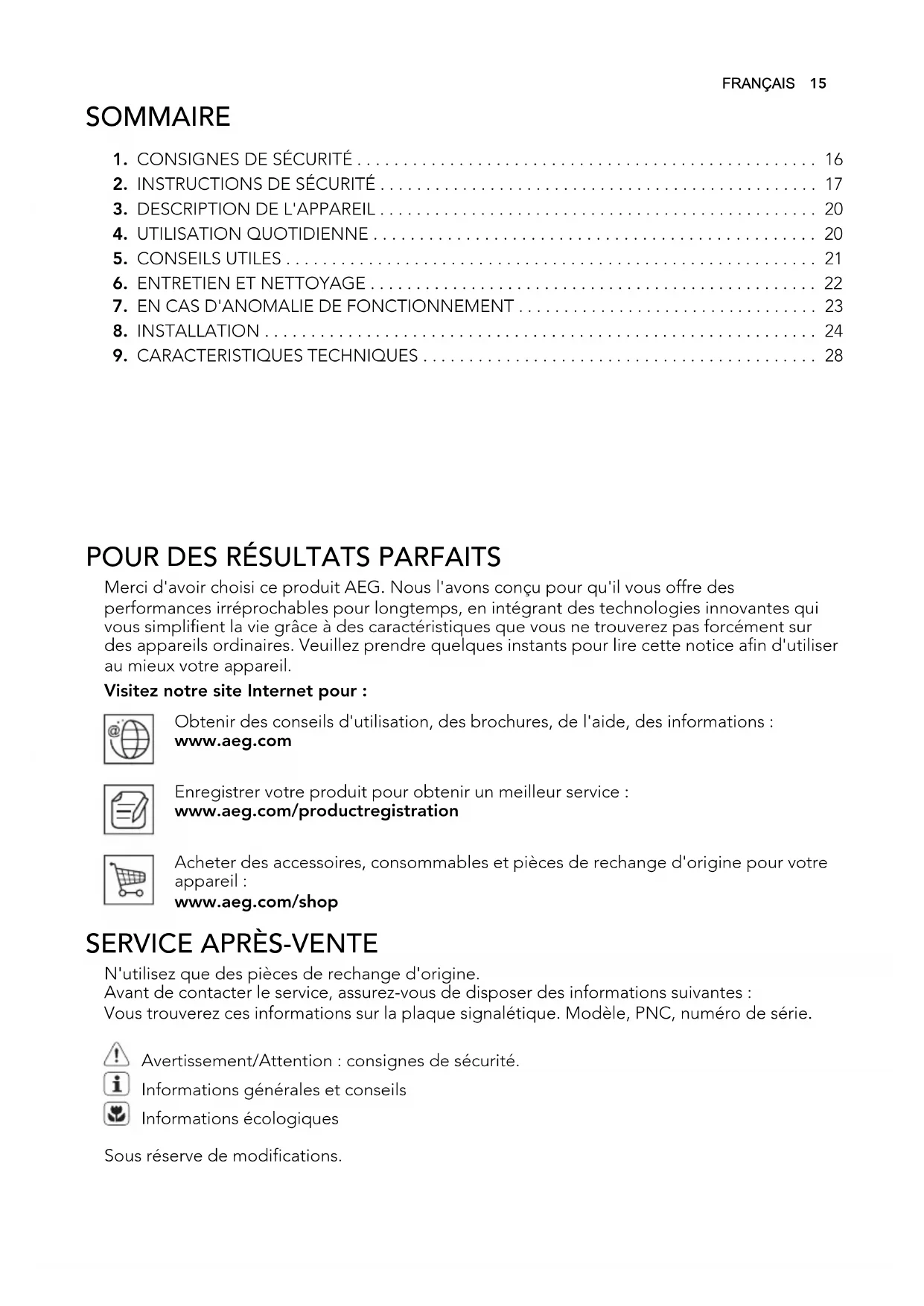 N'utilisez que des pièces de rechange d'origine. Avant de contacter le service, assurez-vous de disposer des informations suivantes : Vous trouverez ces informations sur la plaque signalétique. Modèle, PNC, numéro de série. Avertissement/Attention : consignes de sécurité. Informations générales et conseils Informations écologiques Sous réserve de modifications.