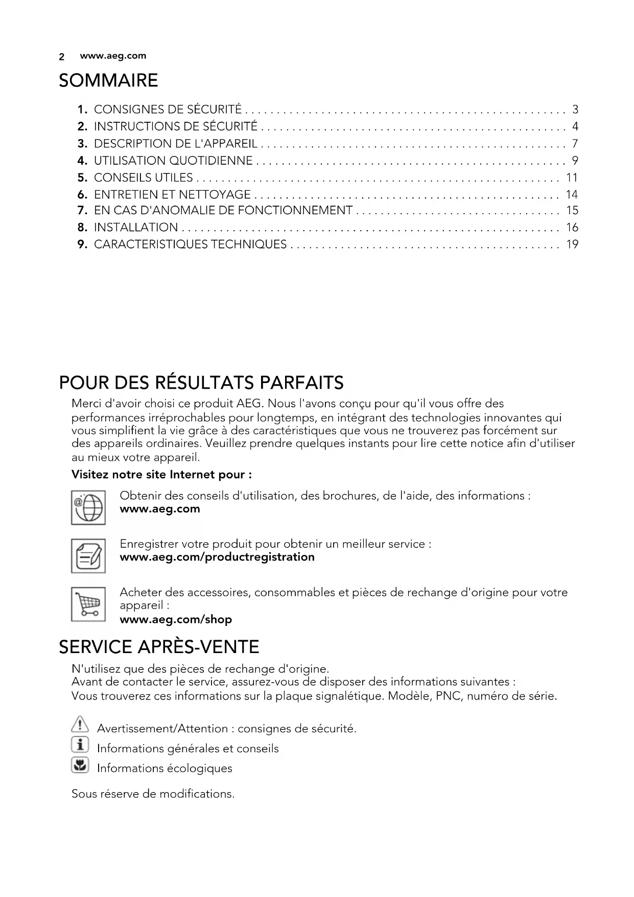 N'utilisez que des pièces de rechange d'origine. Avant de contacter le service, assurez-vous de disposer des informations suivantes : Vous trouverez ces informations sur la plaque signalétique. Modèle, PNC, numéro de série. Avertissement/Attention : consignes de sécurité. Informations générales et conseils Informations écologiques Sous réserve de modifications.