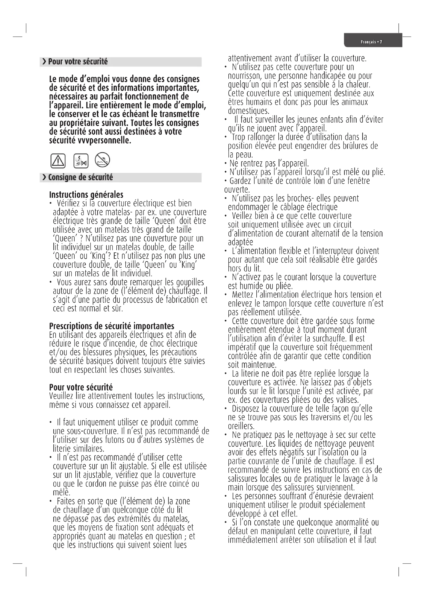 - Cette couverture doit être gardée sous forme entièrement étendue à tout moment durant l'utilisation afin d'éviter la surchauffe. Il est imperatif que la couverture soit féquèment contrôleé afin de garantir que cette condition soit maintainue.
