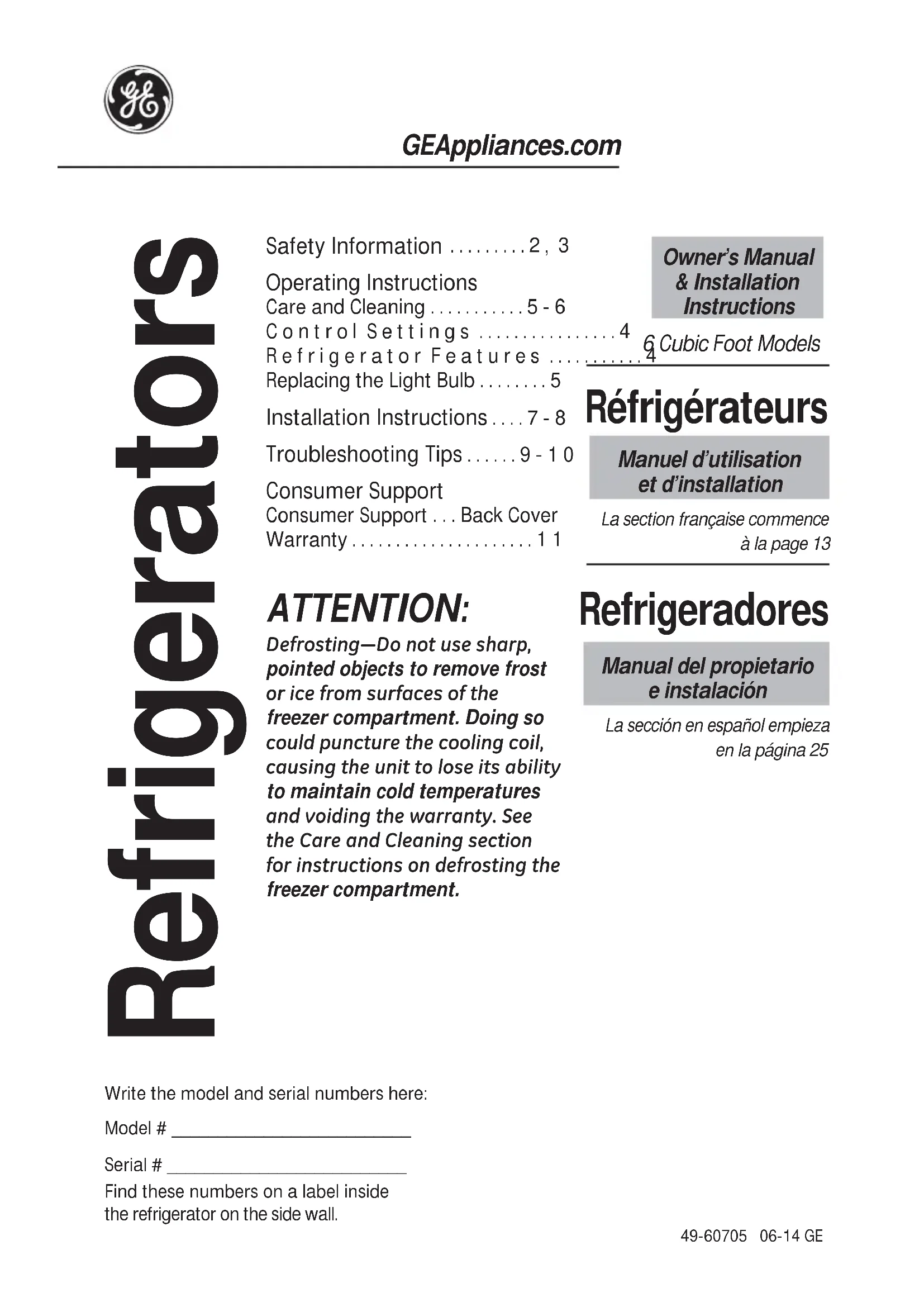 - Veuillez avoir votre numéro de série et votre numéro de modèle à portée de main lorsque vous appelez pour obtenir un service. Agrafez votre facture ici. Pour bénéficier du service de réparation sous garantie, une preuve de la date d’achat initial est nécessaire. EXCLUSION DES GARANTIES TACITES - Votre recours exclusif est l’échange du produit suivant les modalités de la Garantie Limitée. Toutes garanties tacites, y compris les garanties de valeurs marchandes ou d’adéquation à des fins particulières, sont limitées à une durée d’un an ou à la durée la plus courte autorisée par la loi. 3RXUOHVFOLHQWVGHVeWDWV8QLVCette garantie est étendue à l’acheteur d’origine et aux propriétaires suivants pour tout produit acheté pour une utilisation domestique aux États-Unis. Si le produit est installé dans une région où ne se trouve aucun réparateur autorisé GE, vous devrez peut-être assumer les frais de transport ou apporter l’appareil à un centre de service autorisé GE. En Alaska, cette garantie exclut le coût d’expédition ou de dépannage à votre domicile. Certains états n’acceptent pas d’exclusion ou de limites aux dommages indirects consécutifs. Certains droits particuliers vous sont dévolus en vertu de la présente garantie et peuvent s’accompagner d’autres droits qui varient selon votre lieu de résidence. Pour connaître vos droits juridiques, veuillez consulter le bureau local ou le bureau d’état des affaires aux consommateurs ou le Procureur Général de votre état. Garant : États-Unis : General Electric Company. Louisville, KY 40225 3RXUOHVFOLHQWVDX&DQDGDCette garantie est étendue à l’acheteur d’origine et aux propriétaires suivants pour tout produit acheté aux Canada pour une utilisation domestique aux Canada.Le service à domicile en vertu de la garantie sera fourni dans les régions où il est disponible et où Mabe estime raisonnable de le fournir. Garant Canada: MC Commercial, Burlington, Ontario, L7R 5B6 Pendant la période de garantie de : GE remplacera : Un An A compter de la date d’achat initial Toute pièce du réfrigérateur qui s’avère défectueuse en raison d’un défaut de matériau ou de fabrication. Pendant la validité de la Srésente garantie limitée d’un an, GE fournira également gratuitement la main d’œuvre et le service pour réparer la pièce défectueuse.Printed in China Soutien au consommateur. Site Web appareils électroménagers GE electromenagersge.ca Vous avez une question ou vous avez besoin d’aide pour votre appareil électroménager? Contactez-nous par Internet au site HOHFWURPHQDJHUVJHFD 24 heures par jour, tous les jours de l’année. Service de réparations electromenagersge.ca Expert GE repair service is only one step away from your door. Get on-line and schedule your service at your convenience 24 hours any day of the year! Or call 800.GE.CARES (800.432.2737) during normal business hours. Studio de conception réaliste Sur demande, GE peut fournir une brochure sur l’aménagement d’une cuisine pour les personnes à mobilité réduite. Écrivez: Directeur, Relations avec les consommateurs, Mabe Canada Inc. Bureau 310, 1 Factory Lane Moncton, N.B. E1C 9M3 Prolongation de garantie Veuillez consulter votre annuaire local pour trouver un fournisseur de garantie prolongée. Pièces et accessoires Ceux qui désirent réparer eux-mêmes leurs électroménagers peuvent recevoir pièces et accessoires directement à la maison (cartes VISA, MasterCard et Discover acceptées). Les directives stipulées dans le présent manuel peuvent être effectuées par n’importe quel utilisateur. Les autres réparations doivent généralement être effectuées par un technicien qualifié. Soyez prudent, car une réparation inadéquate peut affecter le fonctionnement sécuritaire de l’appareil. Vous trouverez dans les pages jaunes de votre annuaire le numéro du Centre de service Mabe le plus proche. Autrement, appelez-nous au 1.888.261.3055. Contactez-nous Si vous n’êtes pas satisfait du service après-vente dont vous avez bénéficié : 3UHPLqUHPHQW communiquez avec les gens qui ont réparé votre appareil. (QVXLWH si vous n’êtes toujours pas satisfait envoyez tous les détails–numéro de téléphone compris–au Directeur, Relations avec les consommateurs, Mabe Canada Inc. Bureau 310, 1 Factory Lane Moncton, N.B. E1C 9M3 Inscrivez votre appareil électroménager ,QVFULYH]YRWUHDSSDUHLOpOHFWURPpQDJHUHQGLUHFWDXVVLW{WTXHSRVVLEOH Cela améliorera nos communications et notre service après-vente. Vous pouvez également nous envoyer par la poste le formulaire d’inscription joint à votre documentation.25 Información de Seguridad p. 26