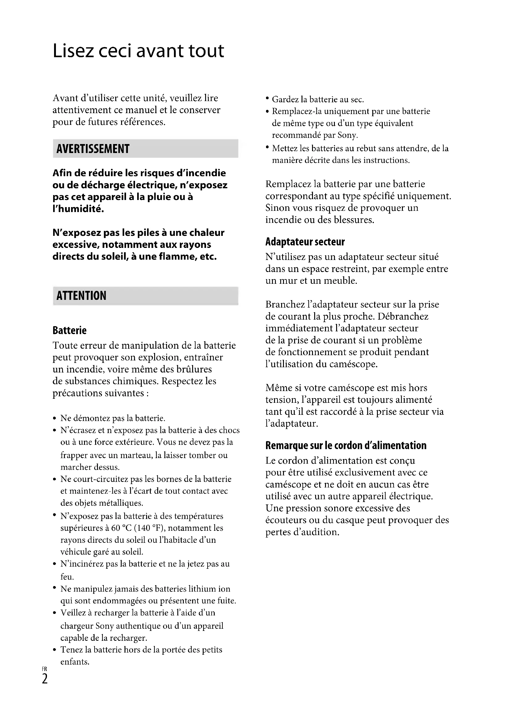Gardez la batterie au sec.Remplacez-la uniquement par une batterie de même type ou d’un type équivalent recommandé par Sony.Mettez les batteries au rebut sans attendre, de la manière décrite dans les instructions. Remplacez la batterie par une batterie correspondant au type spécifié uniquement. Sinon vous risquez de provoquer un incendie ou des blessures. Adaptateur secteur N’utilisez pas un adaptateur secteur situé dans un espace restreint, par exemple entre un mur et un meuble. Branchez l’adaptateur secteur sur la prise de courant la plus proche. Débranchez immédiatement l’adaptateur secteur de la prise de courant si un problème de fonctionnement se produit pendant l’utilisation du caméscope. Même si votre caméscope est mis hors tension, l’appareil est toujours alimenté tant qu’il est raccordé à la prise secteur via l’adaptateur. Remarque sur le cordon d’alimentation Le cordon d’alimentation est conçu pour être utilisé exclusivement avec ce caméscope et ne doit en aucun cas être utilisé avec un autre appareil électrique. Une pression sonore excessive des écouteurs ou du casque peut provoquer des pertes d’audition.