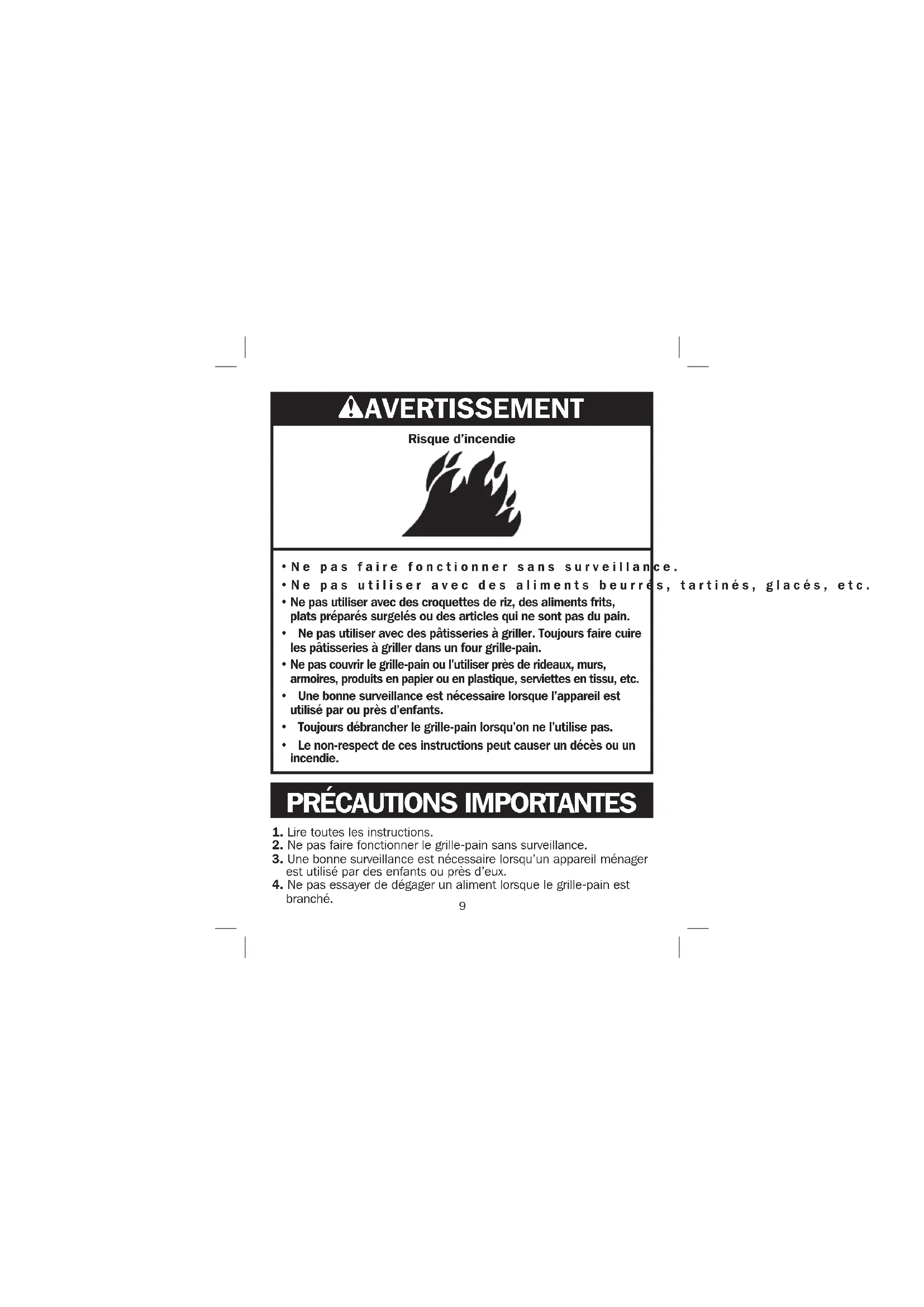 - Un incendie peut survenir si le grille-pain est utilisé pour chauffer des croquettes de riz, des aliments frits, des aliments ne sont faits à base de pain ou des pâtisseries pour griller. Les pâtisseries à griller devraient être réchauffées dans un four grille-pain. Ne pas faire chauffer d'aliments sur lesquels on a étendu margarine, beurre, gelée, glaçage, sirop ou autre garniture. Suivre le Guide d'utilisation.