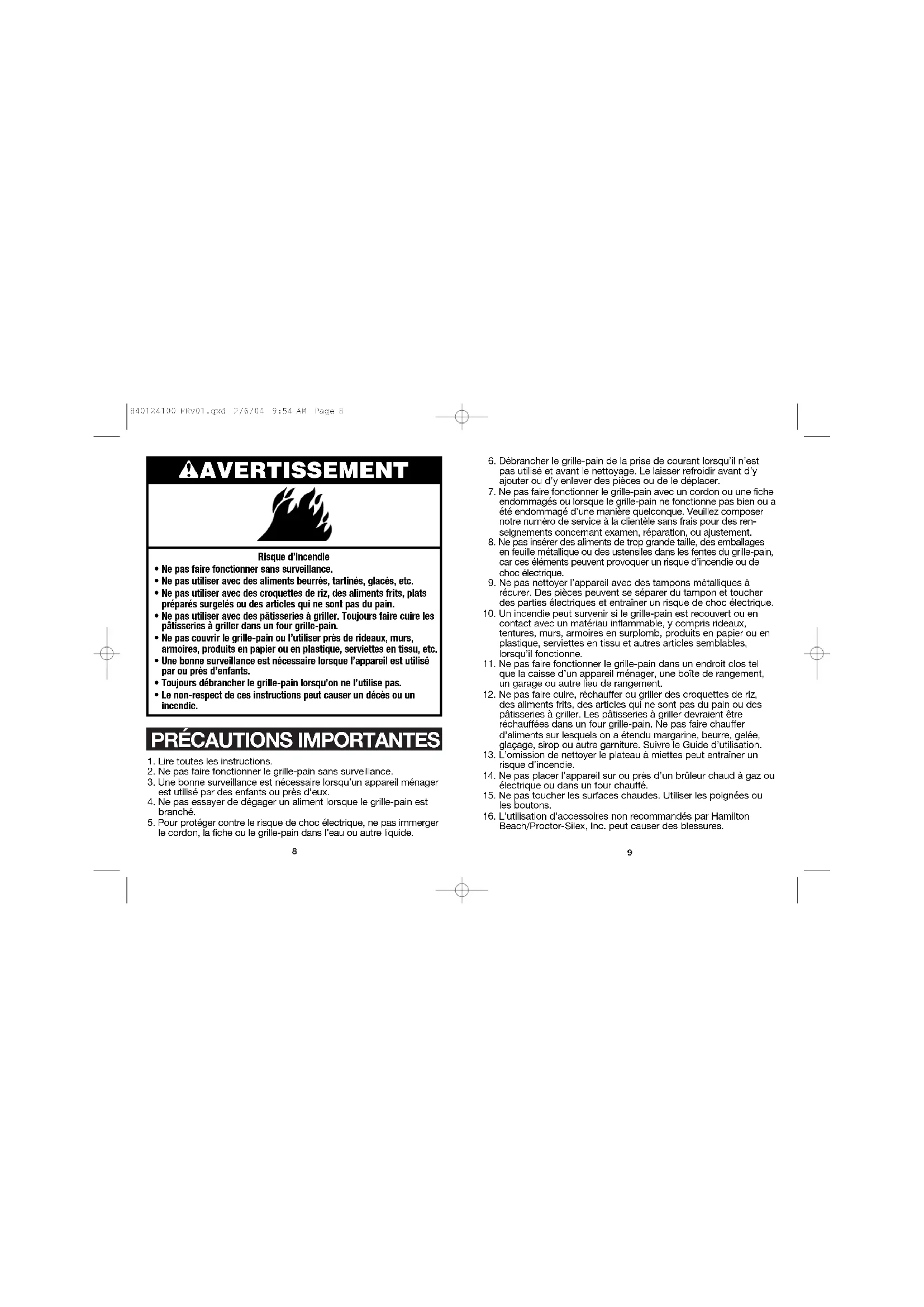 Beach/Proctor-Silex, Inc. peut causer des blessures. wAVERTISSEMENT Risque d’incendie