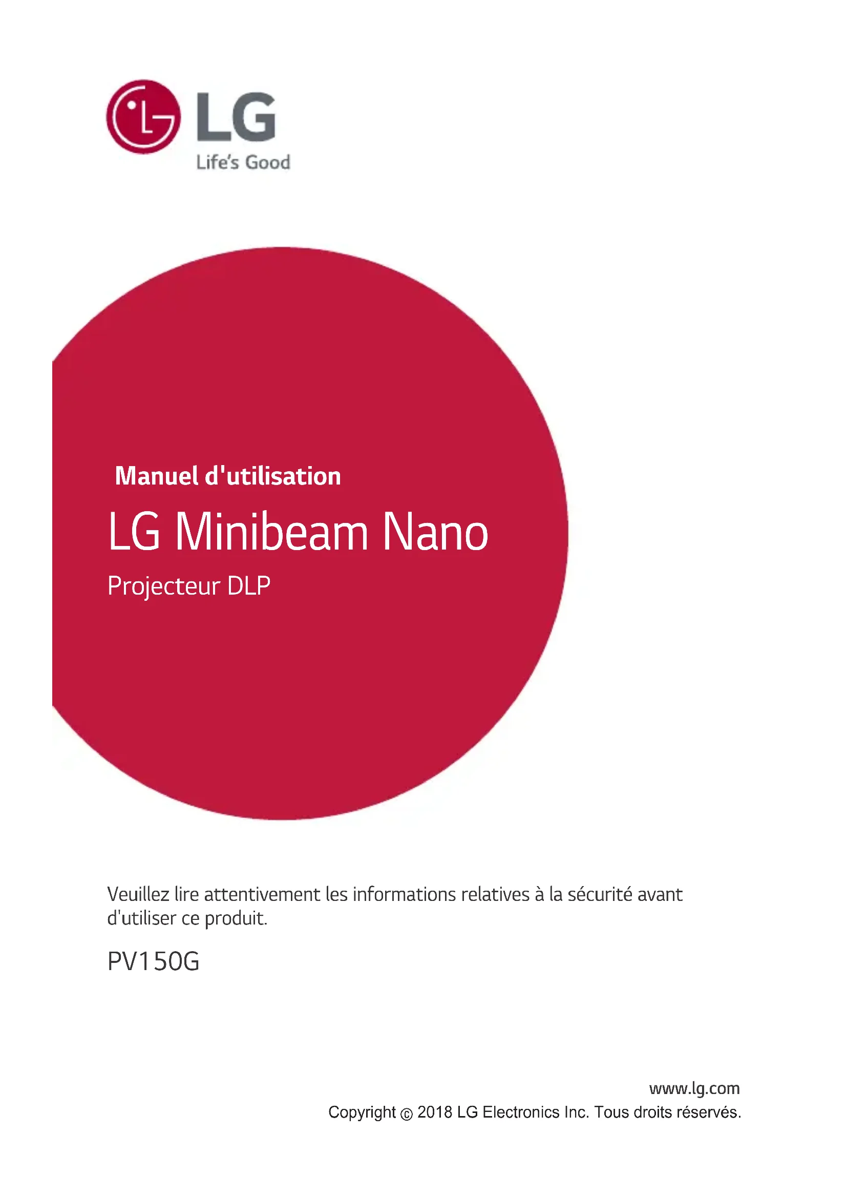 www.lg.com Manuel d'utilisation LG Minibeam Nano Projecteur DLP PV150G Veuillez lire attentivement les informations relatives à la sécurité avant d'utiliser ce produit. Copyright ⓒ 2018 LG Electronics Inc. Tous droits réservés.2 LICENCES LICENCES Les licences prises en charge peuvent varier d'un modèle à l'autre. Pour plus d'informations sur les licences, consultez le site www.lg.com. Fabriqué sous licence de Dolby Laborato- ries. Dolby et le symbole double-D sont des marques déposées de Dolby Laboratories. This DivX Certied