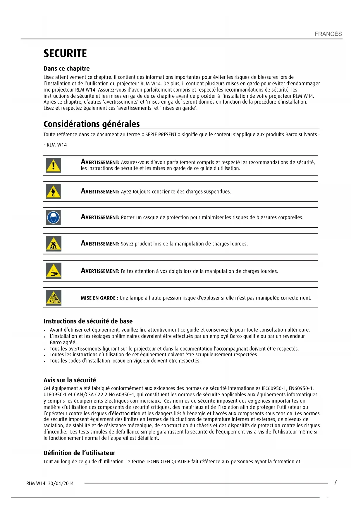 For disposal of used batteries, always consult federal, state, local and provincial hazardous waste disposal rules and regulations to ensure proper disposal.RLM W14 30/04/2014 FRANCÉS SECURITE Dans ce chapitre Lisez attentivement ce chapitre. Il contient des informations importantes pour éviter les risques de blessures lors de l’installation et de l’utilisation du projecteur RLM W14. De plus, il contient plusieurs mises en garde pour éviter d’endommager me projecteur RLM W14. Assurez-vous d’avoir parfaitement compris et respecté les recommandations de sécurité, les instructions de sécurité et les mises en garde de ce chapitre avant de procéder à l’installation de votre projecteur RLM W14. Après ce chapitre, d’autres ‘avertissements’ et ‘mises en garde’ seront donnés en fonction de la procédure d’installation. Lisez et respectez également ces ‘avertissements’ et ‘mises en garde’. Considérations générales Toute référence dans ce document au terme « SERIE PRESENT » signifie que le contenu s’applique aux produits Barco suivants : - RLM W14