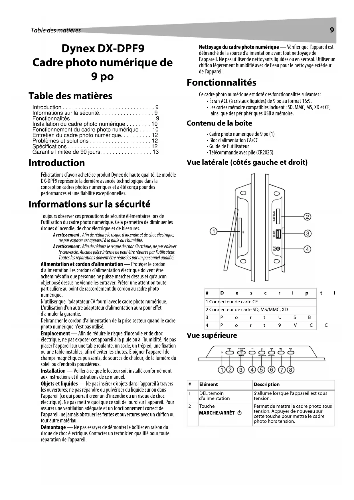 Félicitations d'avoir acheté ce produit Dynex de haute qualité. Le modele DX-DPF9 représentée la dernière avancée technologique dans la conception cadres photos numériques et a été consu pour des performances et une fiabilité exceptionnelles.