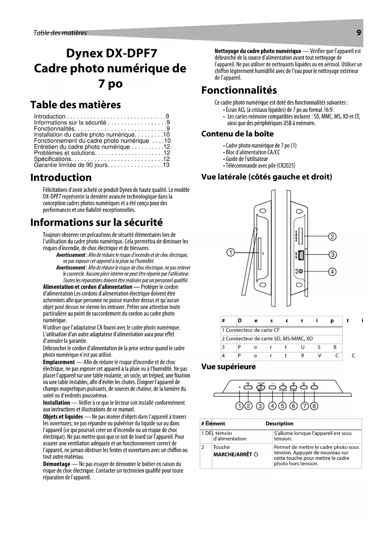 Félicitations d'avoir acheté ce produit Dynex de haute qualité. Le modele DX-DPF7 représentée la dernière avancée technologique dans la conception cadres photos numériques et a été consq pour des performances et une fiabilité exceptionnelles.