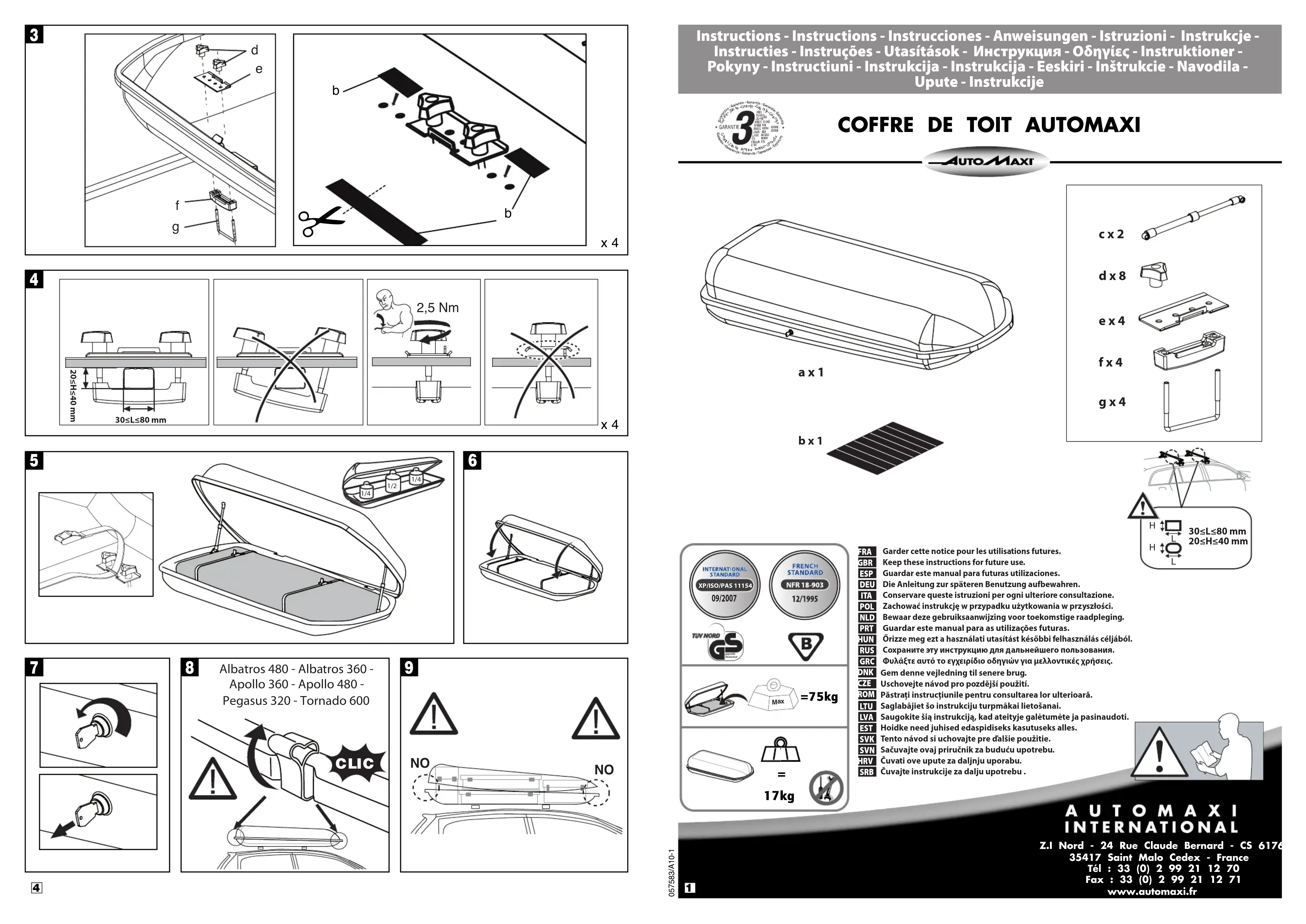 | Informations générales | Garantie : 2 ans, Disponible en plusieurs couleurs, Compatible avec les véhicules équipés de barres de toit |