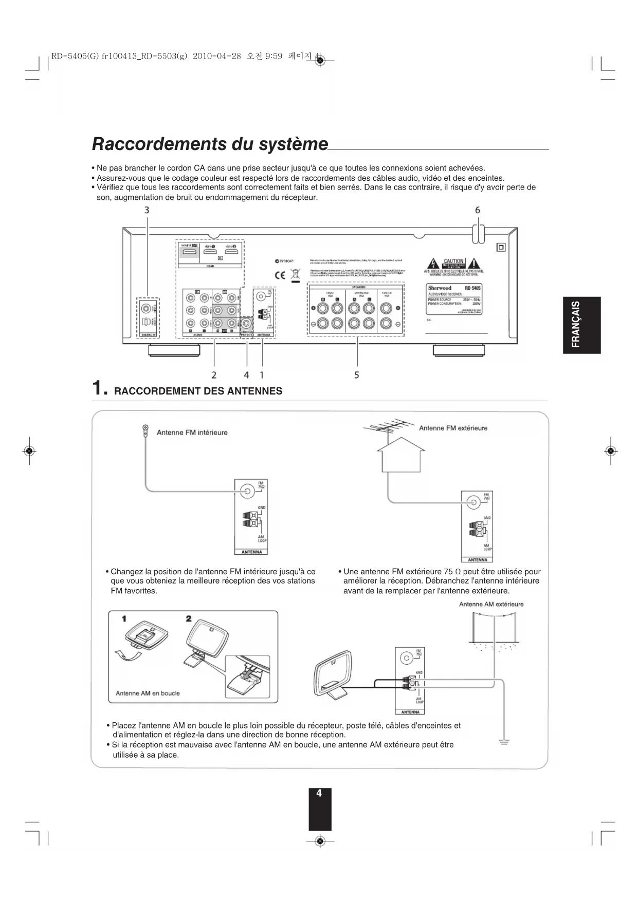 - Vérifiez que tous les raccordements sont correctement faits et bien serrés. Dans le cas contraire, il risque d'y avoir perte de son, augmentation de bruit ou endommagement du récepteur. RD-5405(G) fr100413_RD-5503(g) 2010-04-28 오전 9:59 페이지 42. CONNEXION DE COMPOSANTS AUDIO/VIDEO