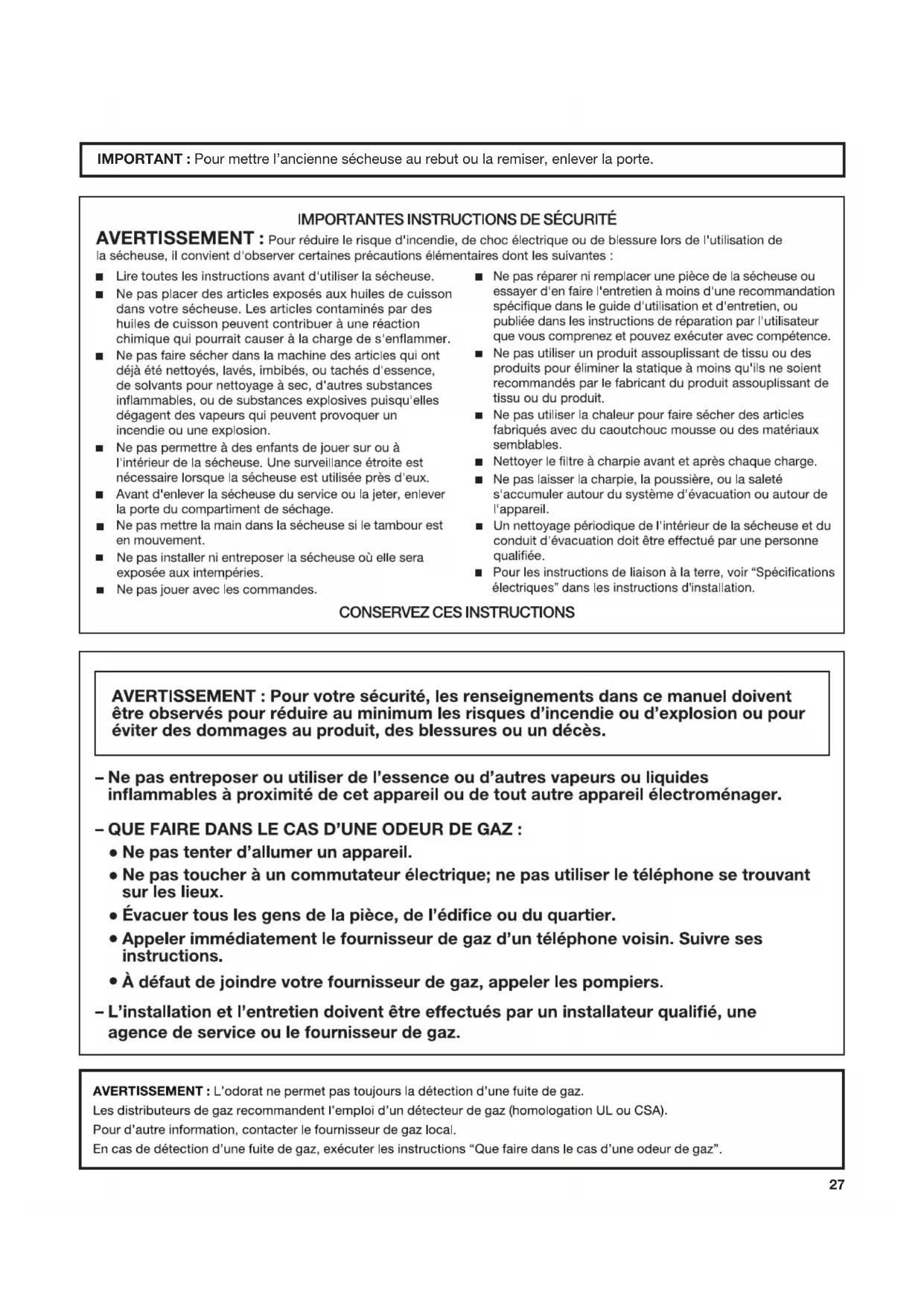 - Ne pas entreposer ou utiliser de l'essence ou d'autres vapeurs ou liquides inflammbables à proximate de cet apparéil ou de tout autre apparéil electroménager.