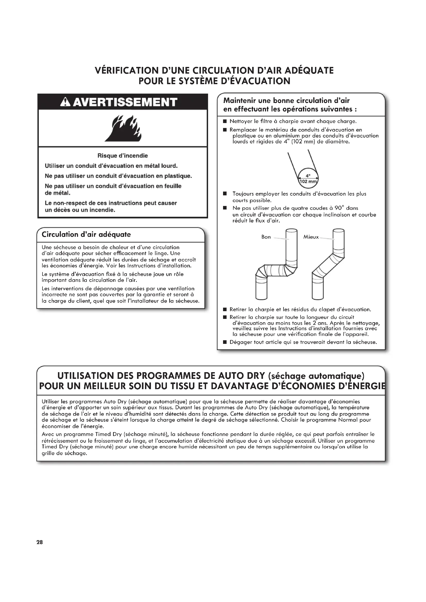 Maintenir une bonne circulation d’air en eectuant les opérations suivantes : n Nettoyer le ltre à charpie avant chaque charge. n Remplacer le matériau de conduits d’évacuation en plastique ou en aluminium par des conduits d’évacuation lourds et rigides de 4" (102 mm) de diamètre.