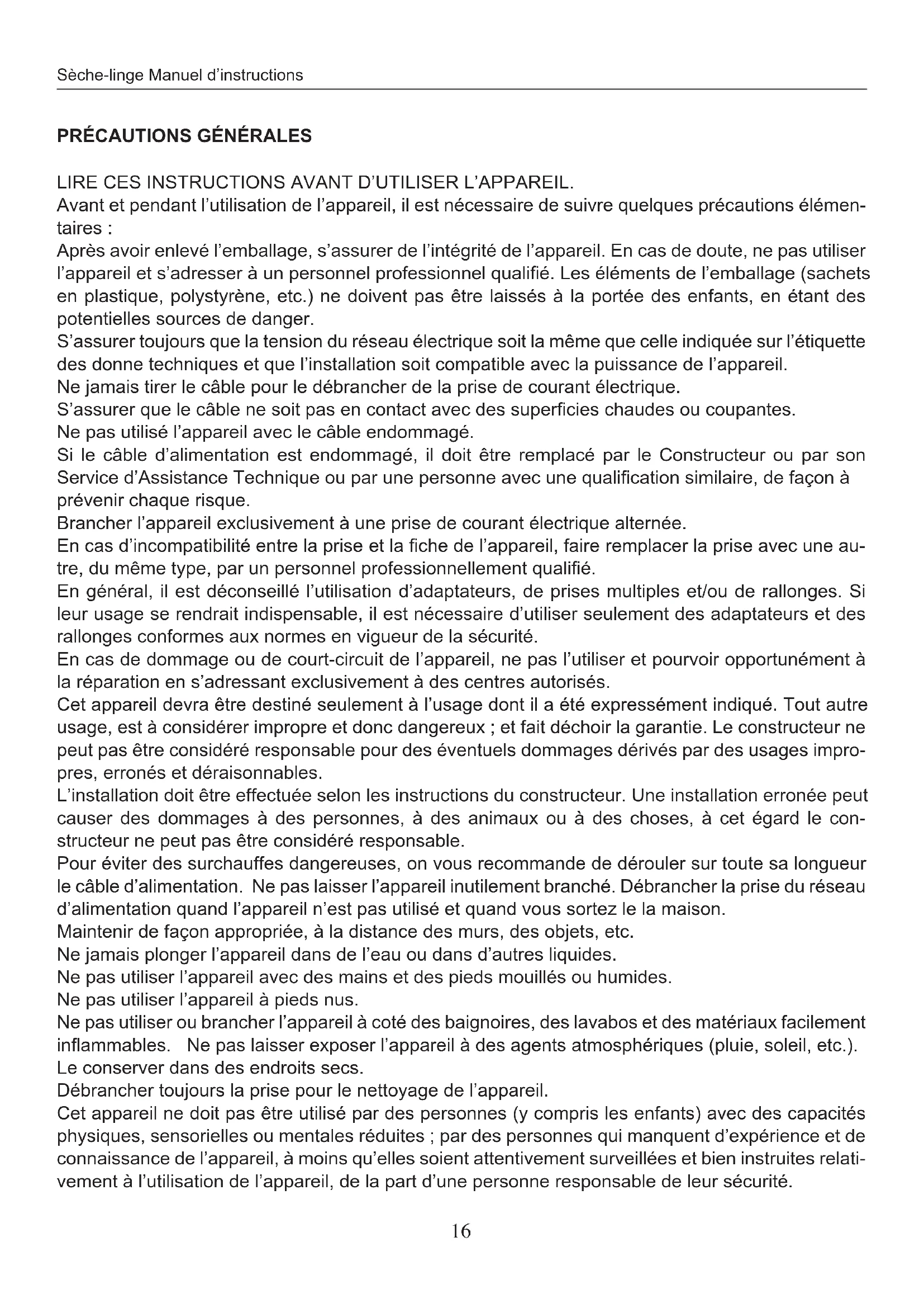 Avant et pendant l'utilisation de l'appareil, il est nécessaire de suivre quelques précautions élémentaires: