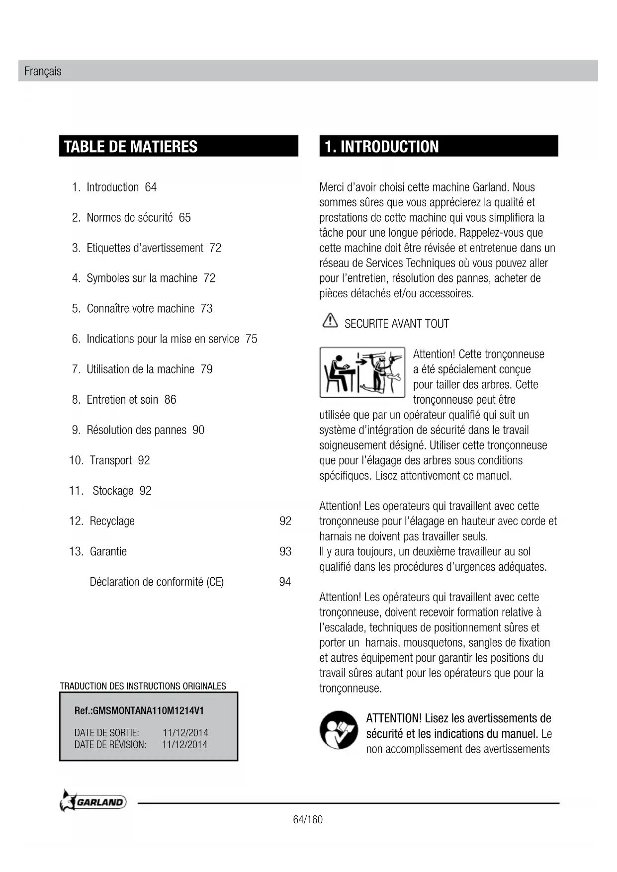 Merci d'avoir choisi cette machine Garland. Nous sommes sûres que vous apprécierez la qualité et prestations de cette machine qui vous simplifiera la tâche pour une longue période. Rappelez-vous que cette machine doit être révisée et entretenue dans un réseau de Services Techniques où vous pouvez aller pour l'entretien, résolution des pannes, acheter de pièces détachés et/ou accessoires.