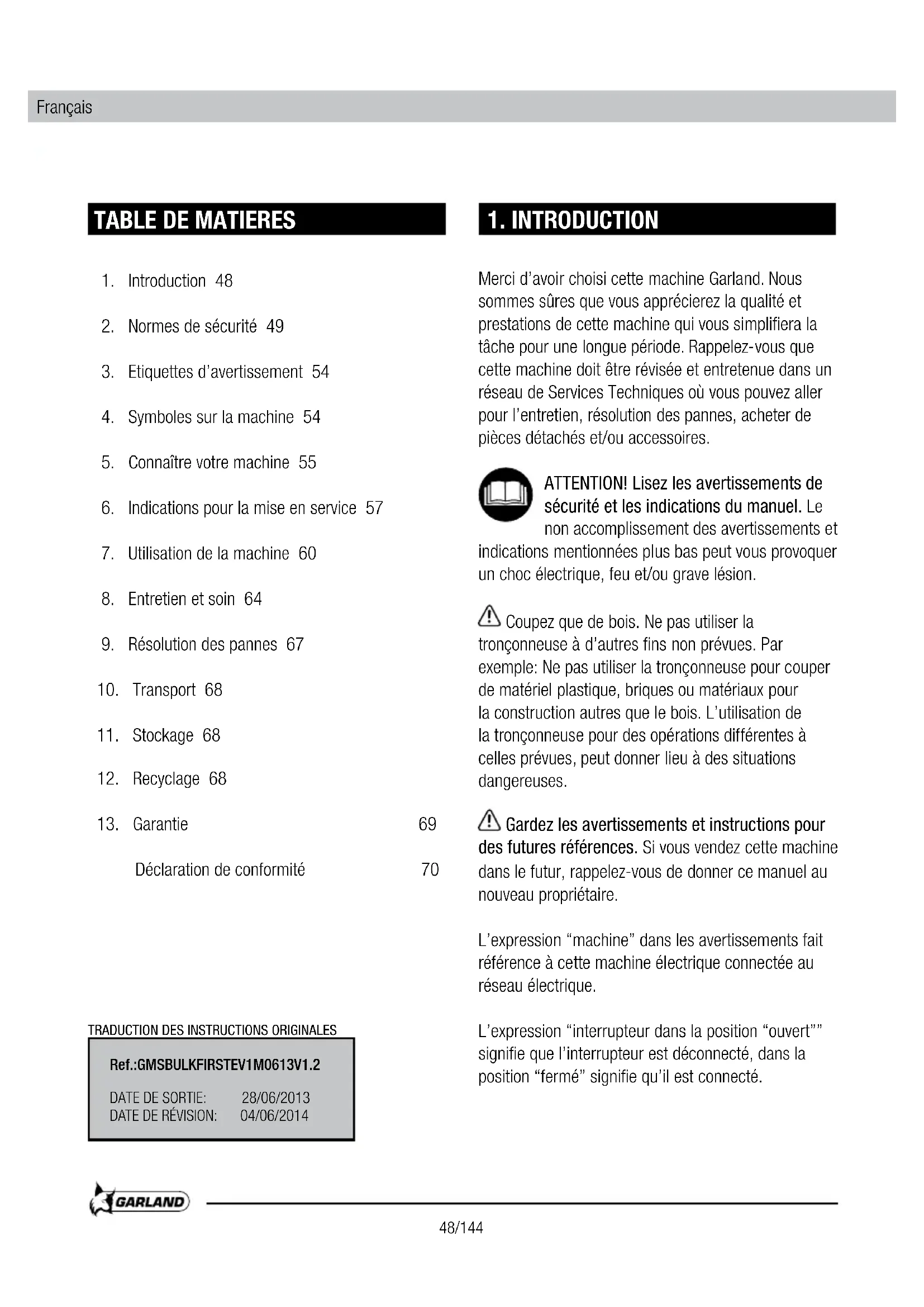 Merci d'avoir choisi cette machine Garland. Nous sommes sûrs que vous apprécierez la qualité et les prestations de cette machine qui vous simplifiera la tâche pour une longue période. Rappelez-vous que cette machine doit être révisée et entretenue dans un réseau de Services Techniques où vous pouvez aller pour l'entretien, la résolution des pannes, l'achat de pièces détachées et/ou d'accessoires.