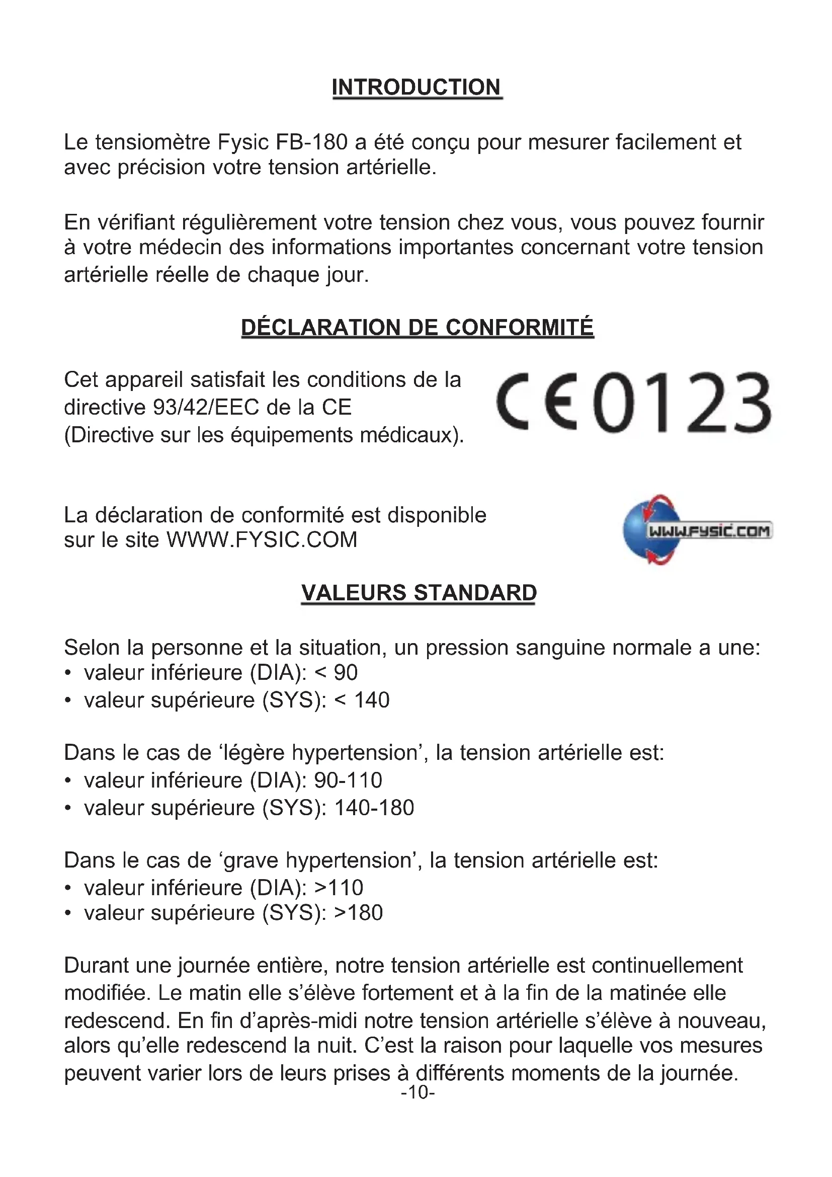 FB180 - Tensiomètre Fysic - Notice d'utilisation et mode d'emploi gratuit