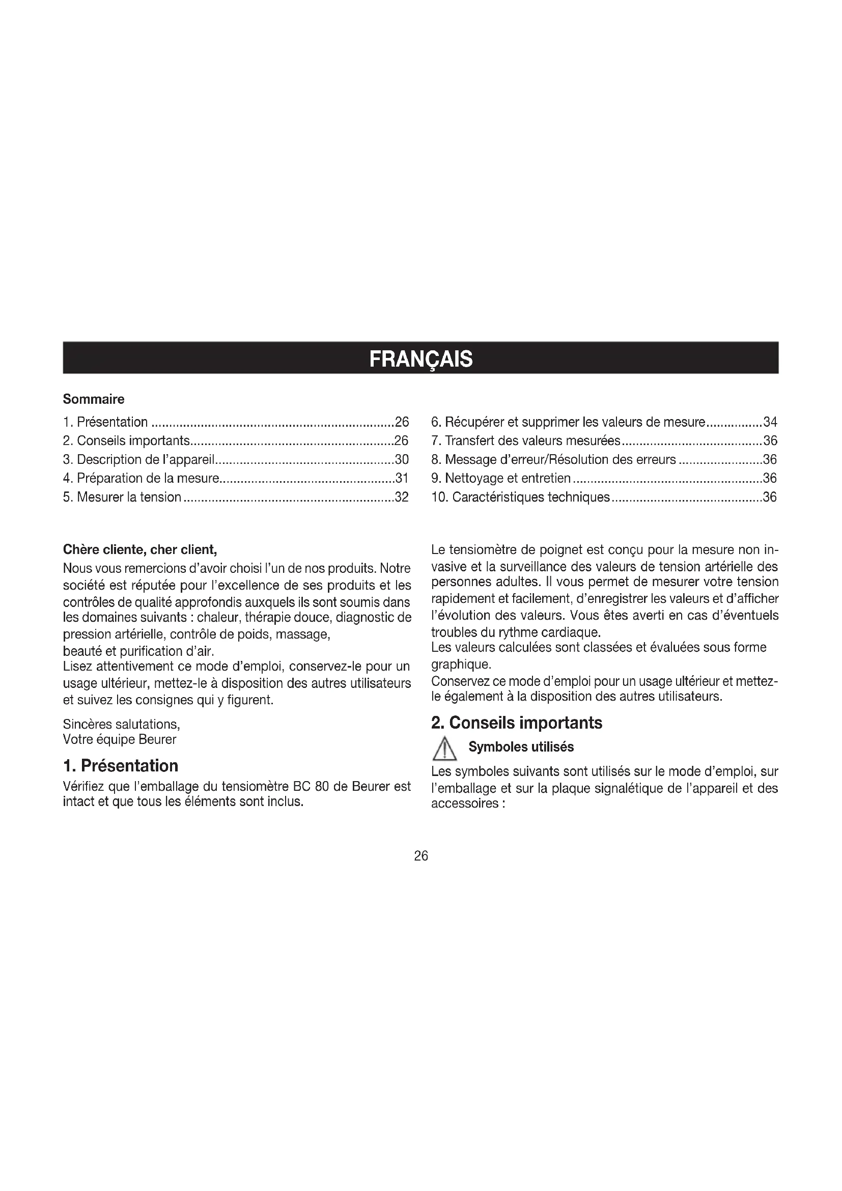 The accuracy of this blood pressure monitor has been care- fully checked and developed with regard to a long useful life. If using the device for commercial medical purposes, it must be regularly tested for accuracy by appropriate means. Pre- cise instructions for checking accuracy may be requested from the service address. Subject to errors and changes26 Chère cliente, cher client, Nous vous remercions d’avoir choisi l’un de nos produits. Notre société est réputée pour l’excellence de ses produits et les contrôles de qualité approfondis auxquels ils sont soumis dans les domaines suivants: chaleur, thérapie douce, diagnostic de pression artérielle, contrôle de poids, massage, beauté et purification d’air. Lisez attentivement ce mode d’emploi, conservez-le pour un usage ultérieur, mettez-le à disposition des autres utilisateurs et suivez les consignes qui y figurent. Sincères salutations, Votre équipe Beurer