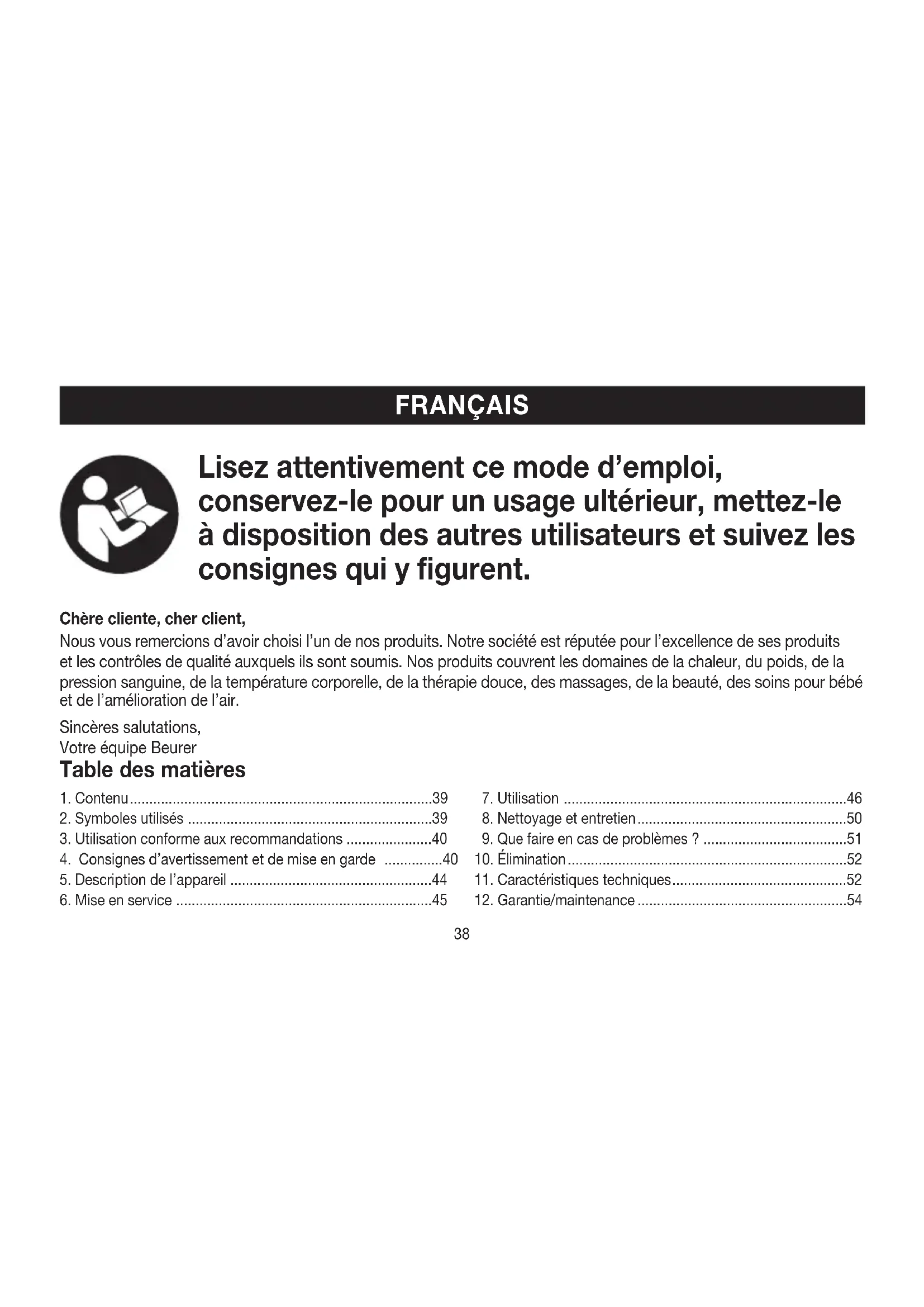Lisez attentivement ce mode d’emploi, conservez-le pour un usage ultérieur, mettez-le à disposition des autres utilisateurs et suivez les consignes qui y figurent. Chère cliente, cher client, Nous vous remercions d’avoir choisi l’un de nos produits. Notre société est réputée pour l’excellence de ses produits et les contrôles de qualité auxquels ils sont soumis. Nos produits couvrent les domaines de la chaleur, du poids, de la pression sanguine, de la température corporelle, de la thérapie douce, des massages, de la beauté, des soins pour bébé et de l’amélioration de l’air. Sincères salutations, Votre équipe Beurer Table des matières