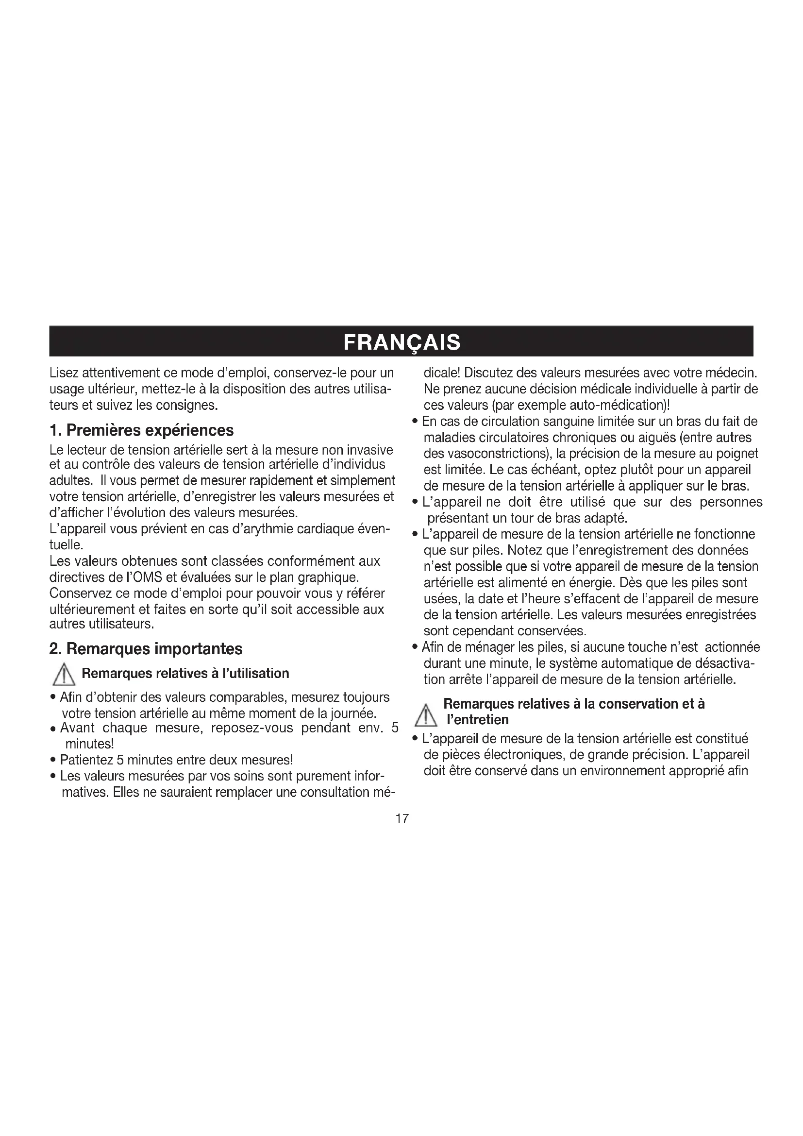 L’appareil de mesure de la tension artérielle est constitué de pièces électroniques, de grande précision. L’appareil doit être conservé dans un environnement approprié afin FRANÇAIS18 de garantir la précision des valeurs et d’optimiser la durée de vie du produit: – Protégez l’appareil des chocs et conservez-le à l’abri de l’humidité, de la poussière, des variations thermiques et d’une exposition directe au soleil. – Ne laissez pas tomber l‘appareil. – N’utilisez pas l’appareil à proximité de forts champs élec- tromagnétique. Eloignez-le des radios ou des télé phones mobiles. – Utilisez uniquement les brassards de rechange fournis ou d’origine. Dans le cas contraire, vous obtiendrez des valeurs mesurées erronées.