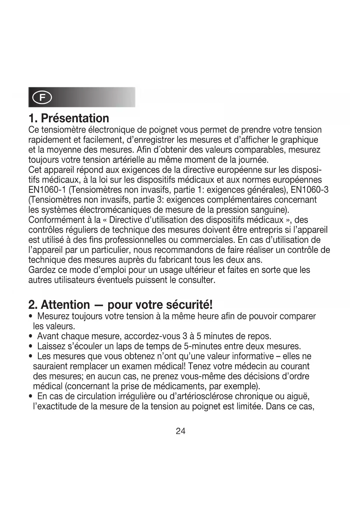 Ce tensiomètre électronique de poignet vous permet de prendre votre tension rapidement et facilement, d’enregistrer les mesures et d’afficher le graphique et la moyenne des mesures. Afin d´obtenir des valeurs comparables, mesurez toujours votre tension artérielle au même moment de la journée. Cet appareil répond aux exigences de la directive européenne sur les disposi- tifs médicaux, à la loi sur les dispositifs médicaux et aux normes européennes EN1060-1 (Tensiomètres non invasifs, partie 1: exigences générales), EN1060-3 (Tensiomètres non invasifs, partie 3: exigences complémentaires concernant les systèmes électromécaniques de mesure de la pression sanguine). Conformément à la « Directive d'utilisation des dispositifs médicaux », des contrôles réguliers de technique des mesures doivent être entrepris si l’appareil est utilisé à des fins professionnelles ou commerciales. En cas d’utilisation de l’appareil par un particulier, nous recommandons de faire réaliser un contrôle de technique des mesures auprès du fabricant tous les deux ans. Gardez ce mode d’emploi pour un usage ultérieur et faites en sorte que les autres utilisateurs éventuels puissent le consulter.