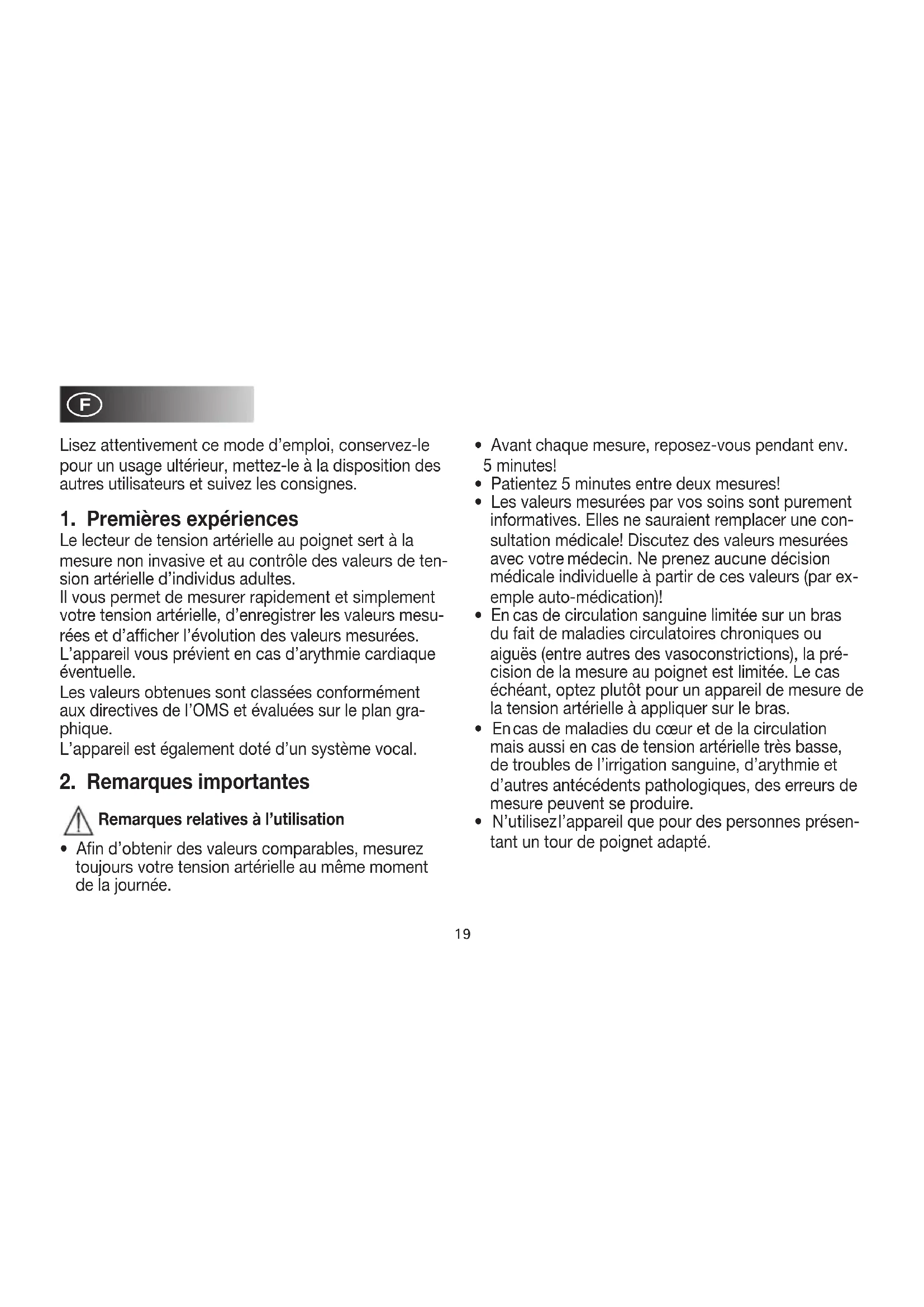 - Avant chaque mesure, reposez- vous pendant env. 5 minutes! Cela peut sinon engendrer des écarts.