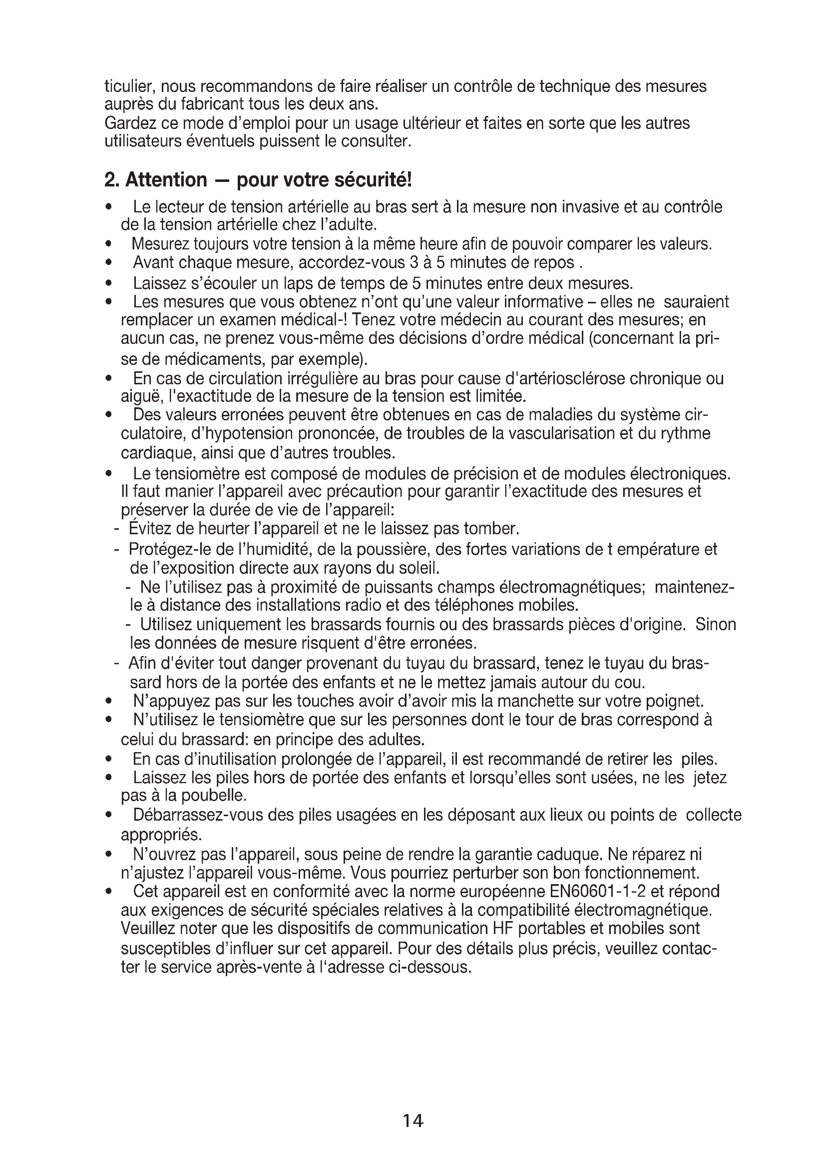 - Letensiomètreestcomposédemodulesdeprécisionetdemodulesélectroniques. Il faut manier l’appareil avec précaution pour garantir l’exactitude des mesures et préserver la durée de vie de l’appareil: - Évitez de heurter l’appareil et ne le laissez pas tomber. - Protégez-le de l’humidité, de la poussière, des fortes variations de t empérature et de l’exposition directe aux rayons du soleil. -Nel’utilisezpasàproximitédepuissantschampsélectromagnétiques;maintenez- le à distance des installations radio et des téléphones mobiles. -Utilisezuniquementlesbrassardsfournisoudesbrassardspiècesd'origine.Sinon lesdonnéesdemesurerisquentd'êtreerronées. - Afin d'éviter tout danger provenant du tuyau du brassard, tenez le tuyau du bras- sardhorsdelaportéedesenfantsetnelemettezjamaisautourducou.