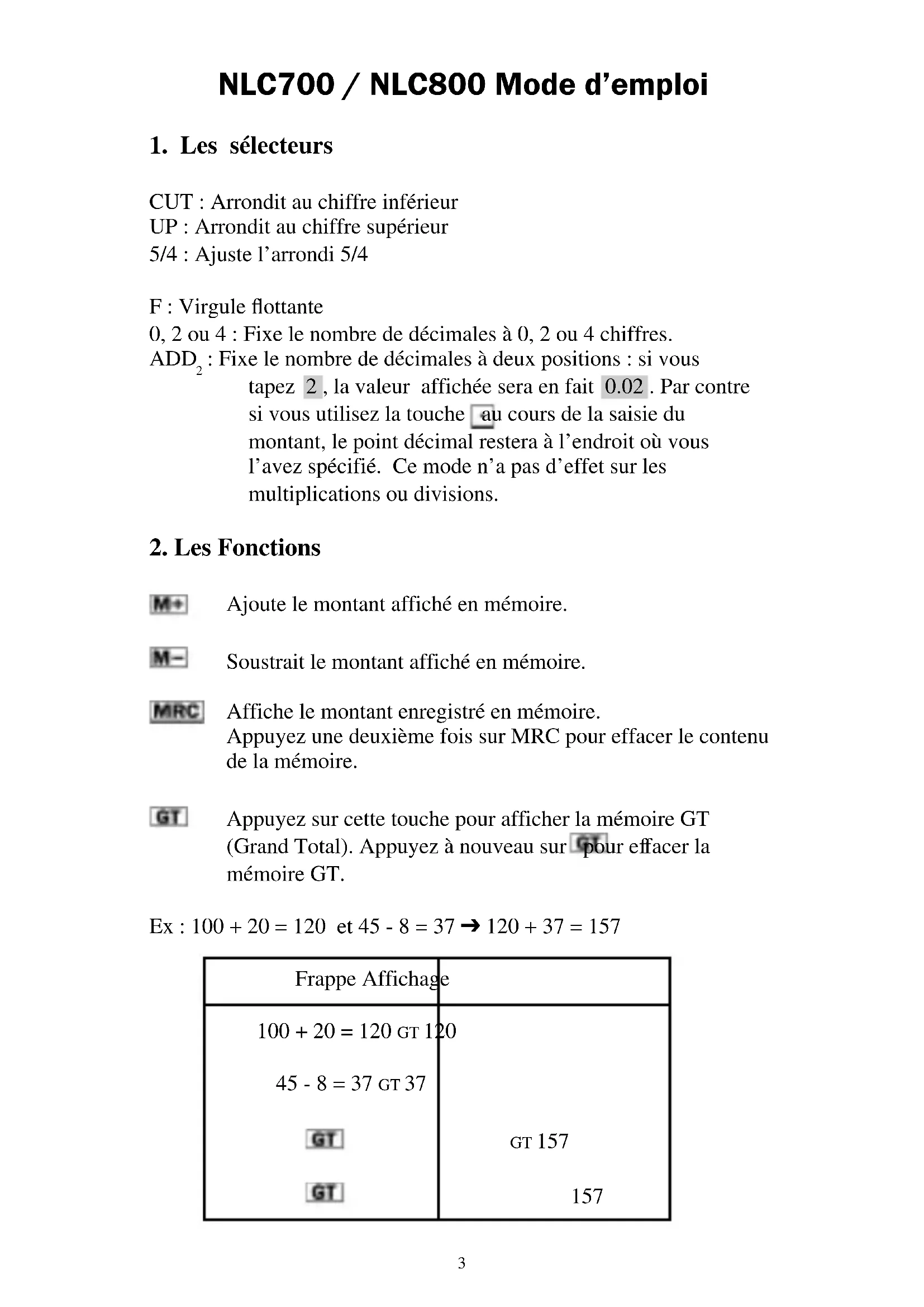 Ajoute le montant affiché en mémoire. Soustrait le montant affiché en mémoire. Affiche le montant enregistré en mémoire. Appuyez une deuxième fois sur MRC pour effacer le contenu de la mémoire. Appuyez sur cette touche pour afficher la mémoire GT (Grand Total). Appuyez à nouveau sur pour effacer la mémoire GT. Ex : 100 + 20 = 120 et 45 - 8 = 37 ➔ 120 + 37 = 157 Frappe Affichage 100 + 20 = 120 GT 120