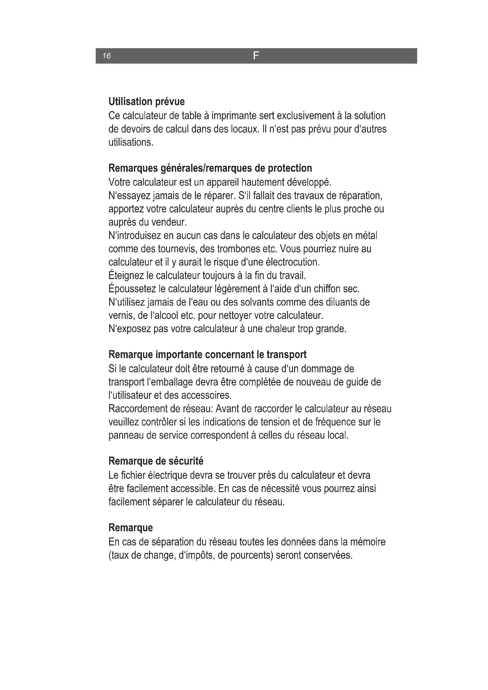 We are sorry for any inconvenience. Yours faithfully Olympia Business Systems Vertriebs GmbH CPD-430 EN 55022: 2006 EN 55024: 1998 + A1: 2001+A2:2003 Februar 2010 Olympia Business Systems Vertriebs GmbH Weg zum Wasserwerk 10 45525 Hattingen16 Utilisation prévue Ce calculateur de table à imprimante sert exclusivement à la solution de devoirs de calcul dans des locaux. Il n‘est pas prévu pour d‘autres utilisations. Remarques générales/remarques de protection Votre calculateur est un appareil hautement développé. N‘essayez jamais de le réparer. S‘il fallait des travaux de réparation, apportez votre calculateur auprès du centre clients le plus proche ou auprès du vendeur. N‘introduisez en aucun cas dans le calculateur des objets en métal comme des tournevis, des trombones etc. Vous pourriez nuire au calculateur et il y aurait le risque d‘une électrocution. Éteignez le calculateur toujours à la fin du travail. Époussetez le calculateur légèrement à l‘aide d‘un chiffon sec. N‘utilisez jamais de l‘eau ou des solvants comme des diluants de vernis, de l‘alcool etc. pour nettoyer votre calculateur. N‘exposez pas votre calculateur à une chaleur trop grande. Remarque importante concernant le transport Si le calculateur doit être retourné à cause d‘un dommage de transport l‘emballage devra être complétée de nouveau de guide de l‘utilisateur et des accessoires. Raccordement de réseau: Avant de raccorder le calculateur au réseau veuillez contrôler si les indications de tension et de fréquence sur le panneau de service correspondent à celles du réseau local. Remarque de sécurité Le fichier électrique devra se trouver près du calculateur et devra être facilement accessible. En cas de nécessité vous pourrez ainsi facilement séparer le calculateur du réseau. Remarque En cas de séparation du réseau toutes les données dans la mémoire (taux de change, d‘impôts, de pourcents) seront conservées. F17 Élimination N‘éliminez pas les appareils électriques en les jetant dans les ordures ménagères. Utilisez à cet effet les centres de collecte de la commune. Demandez à votre municipalité où se trouvent les centres de collecte. En cas d‘élimination non contrôlée des appareils, il est possible que pendant l‘érosion des substances dangereuses parviennent dans la nappe phréatique et ainsi dans la chaîne alimentaire ou empoisonnent la flore et la faune pendant des années. Si vous remplacez l‘appareil par un neuf, le re- vendeur est tenu par la loi de reprendre au moins gratuitement l‘acien dans le but de le faire recycler.