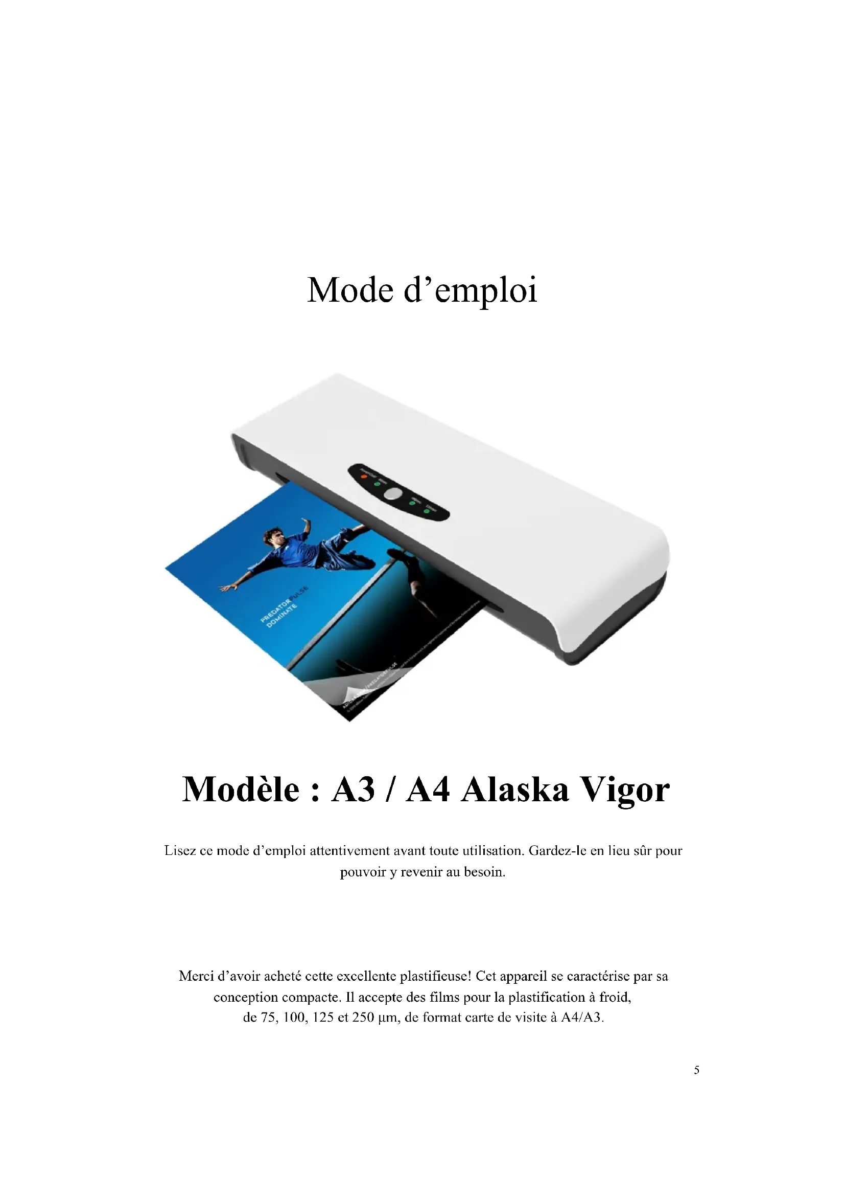 Merci d'avoir acheté cette excellente plastifique! Cet apparéil se caractérisé par sa conception compacte. Il accepte des films pour la plastification à froid, de 75, 100, 125 et 250~ m , de format carte de visite à A4/A3.
