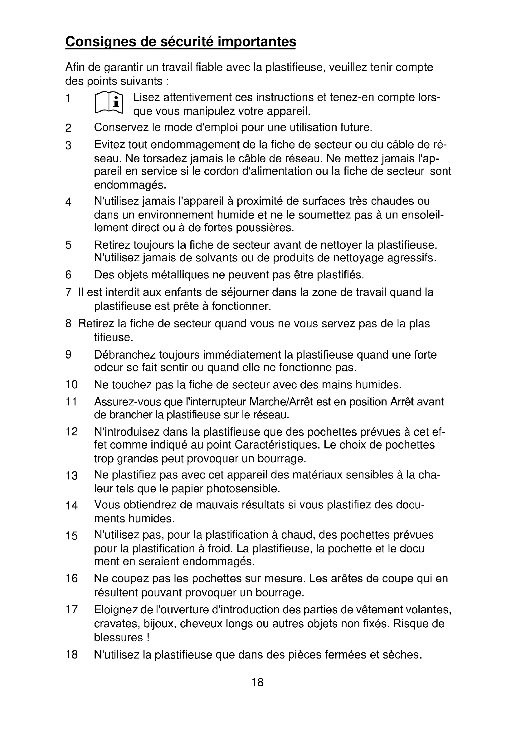 18 N'utilisez la plastifieuse que dans des pièces fermées et sèches.