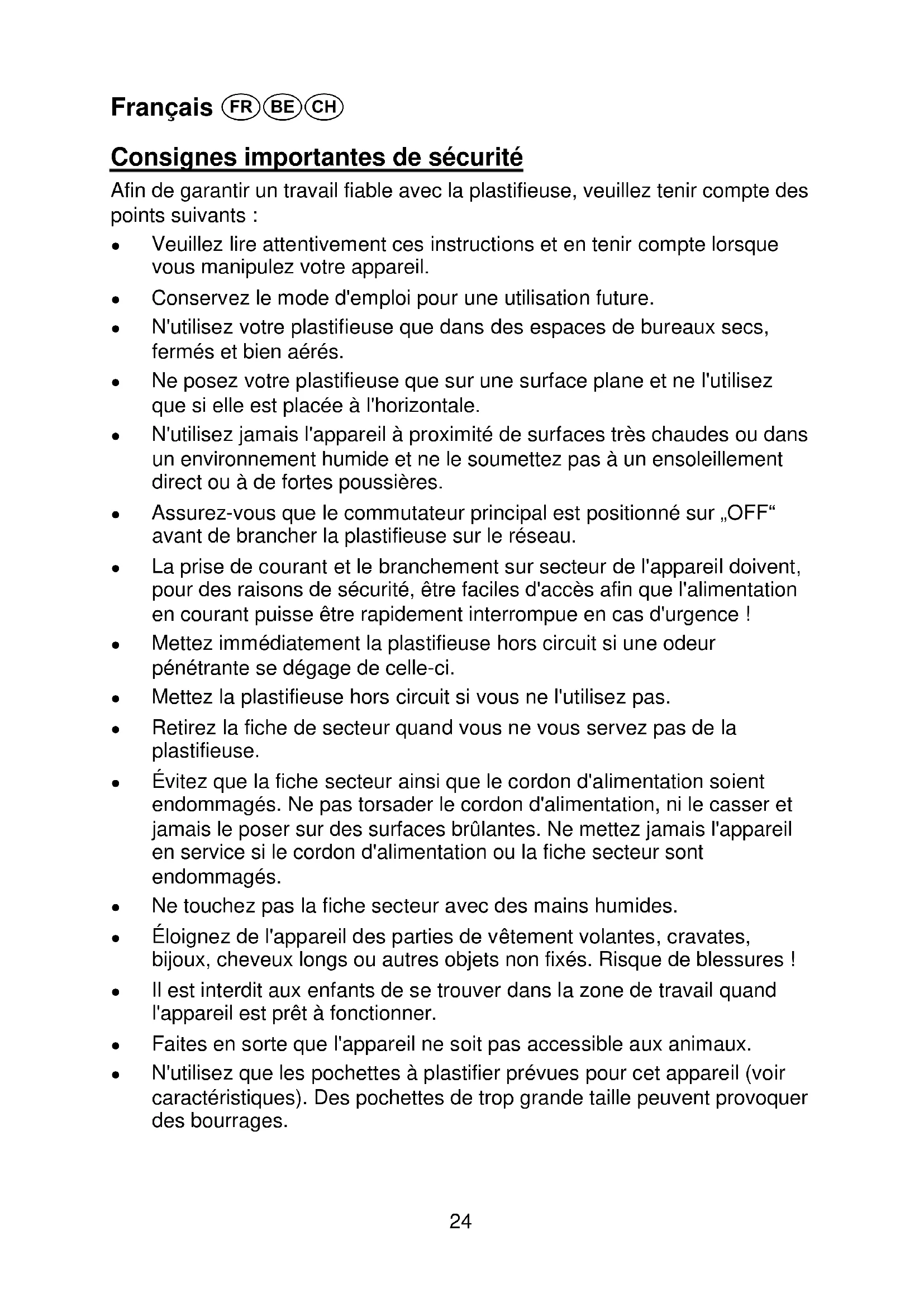 Warranty In the case of a defect, please return the device together with the receipt and original packing material to the point-of-sale. 1 EEA = European Economic Area, which is comprised of the member states of the EU plus Norway, Iceland and Liechtenstein.24 Français Consignes importantes de sécurité Afin de garantir un travail fiable avec la plastifieuse, veuillez tenir compte des points suivants : ● Veuillez lire attentivement ces instructions et en tenir compte lorsque vous manipulez votre appareil. ● Conservez le mode d'emploi pour une utilisation future. ● N'utilisez votre plastifieuse que dans des espaces de bureaux secs, fermés et bien aérés. ● Ne posez votre plastifieuse que sur une surface plane et ne l'utilisez que si elle est placée à l'horizontale. ● N'utilisez jamais l'appareil à proximité de surfaces très chaudes ou dans un environnement humide et ne le soumettez pas à un ensoleillement direct ou à de fortes poussières. ● Assurez-vous que le commutateur principal est positionné sur „OFF“ avant de brancher la plastifieuse sur le réseau. ● La prise de courant et le branchement sur secteur de l'appareil doivent, pour des raisons de sécurité, être faciles d'accès afin que l'alimentation en courant puisse être rapidement interrompue en cas d'urgence ! ● Mettez immédiatement la plastifieuse hors circuit si une odeur pénétrante se dégage de celle-ci. ● Mettez la plastifieuse hors circuit si vous ne l'utilisez pas. ● Retirez la fiche de secteur quand vous ne vous servez pas de la plastifieuse. ● Évitez que la fiche secteur ainsi que le cordon d'alimentation soient endommagés. Ne pas torsader le cordon d'alimentation, ni le casser et jamais le poser sur des surfaces brûlantes. Ne mettez jamais l'appareil en service si le cordon d'alimentation ou la fiche secteur sont endommagés. ● Ne touchez pas la fiche secteur avec des mains humides. ● Éloignez de l'appareil des parties de vêtement volantes, cravates, bijoux, cheveux longs ou autres objets non fixés. Risque de blessures ! ● Il est interdit aux enfants de se trouver dans la zone de travail quand l'appareil est prêt à fonctionner. ● Faites en sorte que l'appareil ne soit pas accessible aux animaux. ● N'utilisez que les pochettes à plastifier prévues pour cet appareil (voir caractéristiques). Des pochettes de trop grande taille peuvent provoquer des bourrages.25 ● N'utilisez pas, pour la plastification à chaud, des pochettes prévues pour la plastification à froid. L'appareil, la pochette ainsi que le document en seraient endommagés. ● Ne coupez pas les pochettes. Les arêtes de coupe qui en résultent pouvant provoquer un bourrage. ● N'utilisez pas de pochettes sales. Le cas échéant, les nettoyer auparavant avec un chiffon doux légèrment humide. ● Des objets métalliques ne peuvent pas être plastifiés. ● Ne plastifiez pas avec cet appareil des matériaux sensibles à la chaleur comme par ex. le papier photosensible. ● Vous obtiendrez de mauvais résultats si vous plastifiez des documents humides. ● Faites impérativement une pause d'au moins 15 secondes entre chaque plastification. ● Laissez refroidir l'appareil au moins 30 minutes en fin d'utilisation. ● Ne le transportez que s'il est refroidi. ● Ne touchez pas des éléments très chauds de la plastifieuse. Risque de brûlure ! Prudence lorsque vous manipulez la pochette plastifiée. Elle est extrêmement chaude ! Informations importantes ● Des pièces justificatives (cartes d'identité) et documents peuvent perdre leur validité s'ils sont plastifiés car leur authenticité ne peut plus alors être prouvée. ● Au cas où vous transmettriez la plastifieuse à d'autres personnes, veuillez toujours y joindre ce mode d'emploi. ● Lorsque vous voulez plastifier des matériaux très souples (tels que serviettes) ou de petits formats, nous recommandons de poser le produit à plastifier dans une feuille de papier pliée afin d'éviter des bourrages éventuels. Introduisez celle-ci avec l'arête de pliage vers l'avant dans la plastifieuse. Exclusion de la garantie Nous ne nous portons pas garants de l'exactitude des informations se rap- portant aux propriétés techniques ainsi qu'à la présente documentation. Le produit décrit dans cette documentation et, le cas échéant, ses accessoires sont soumis à une amélioration et à un perfectionnement technique con- stants. C'est pourquoi nous nous réservons le droit de modifier, en tout temps et sans avertissement préalable, des éléments, des accessoires, des spécifications techniques ainsi que la présente documentation de ce produit.26 Utilisation conforme à son usage Cette plastifieuse permet de plastifier photos, cartes, documents, papiers et autres choses semblables à chaud et à froid. Toute autre utilisation est con- sidérée comme non conforme à son usage. Des modifications ou transfor- mations arbitraires sont interdites. Caractéristiques de performance Protection et façonnage de vos documents. Plastifie photos, documents, graphiques etc. jusqu'au format DIN A3 (A 3024, A 3048) ou DIN A4 (A 2024, A 2048). L'appareil fonctionne avec 4 rouleaux (A 2048, A 3048) ou 2 rouleaux chauf- fants (A 2024, A 3024), a un temps de chauffe rapide et plastifie sans sup- port.
