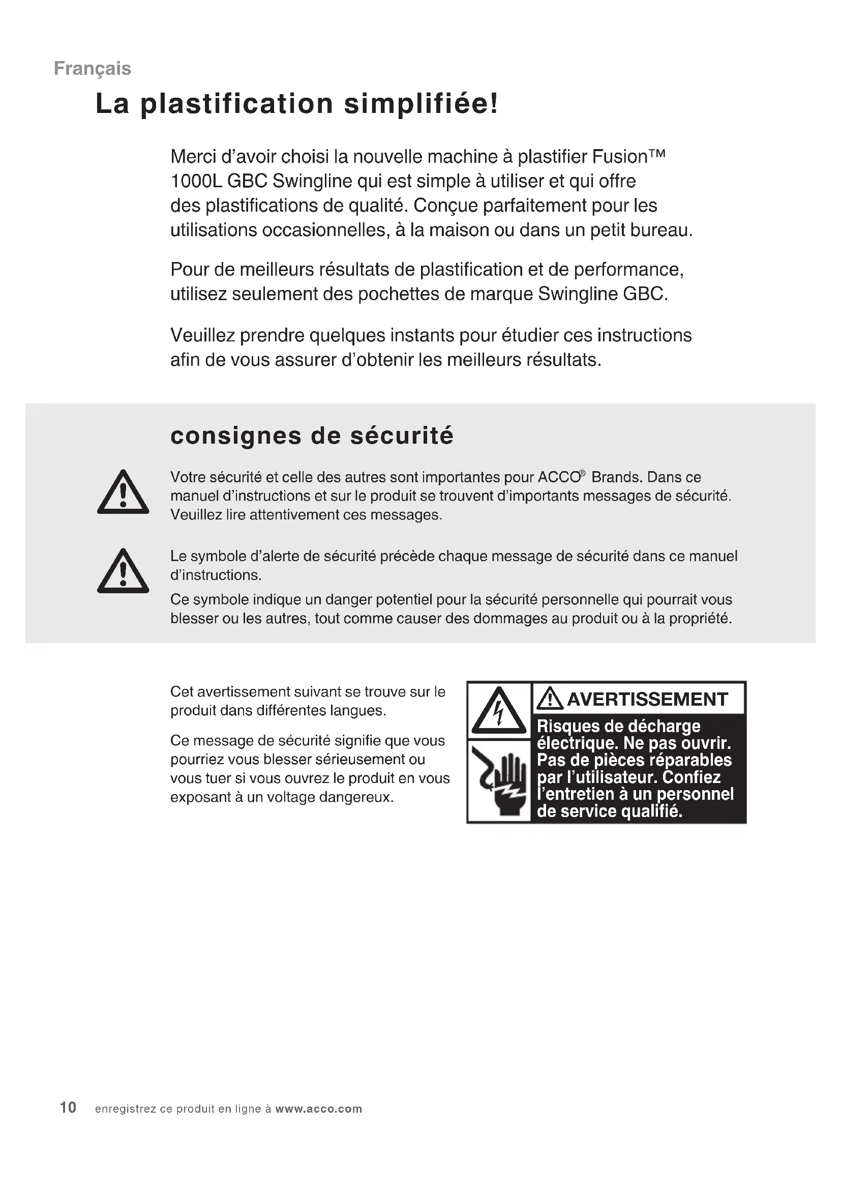 This Class B digital apparatus complies with Canadian ICES-003 MODIFICATIONS Any modications made to this device may void the authority granted to the user by the FCC and/or by Industry Canada to operate this equipment. ACCO is a registered trademark of ACCO Brands. Copyright © 2011 ACCO Brands. All rights reserved. Issue August 2012 Fusion is a registered trademark of ACCO Brands. service address ACCO Brands, 101 Bolton Ave 9E, Booneville, MS 38829 USA Tel. 800-541-0094 www.acco.comFrançais La plastification simplifiée! Merci d’avoir choisi la nouvelle machine à plastier Fusion™ 1000L GBC Swingline qui est simple à utiliser et qui ore des plastications de qualité. Conçue parfaitement pour les utilisations occasionnelles, à la maison ou dans un petit bureau. Pour de meilleurs résultats de plastication et de performance, utilisez seulement des pochettes de marque Swingline GBC. Veuillez prendre quelques instants pour étudier ces instructions an de vous assurer d’obtenir les meilleurs résultats.Risques de décharge électrique. Ne pas ouvrir. Pas de pièces réparables par l’utilisateur. Conez l’entretien à un personnel de service qualié. AVERTISSEMENT