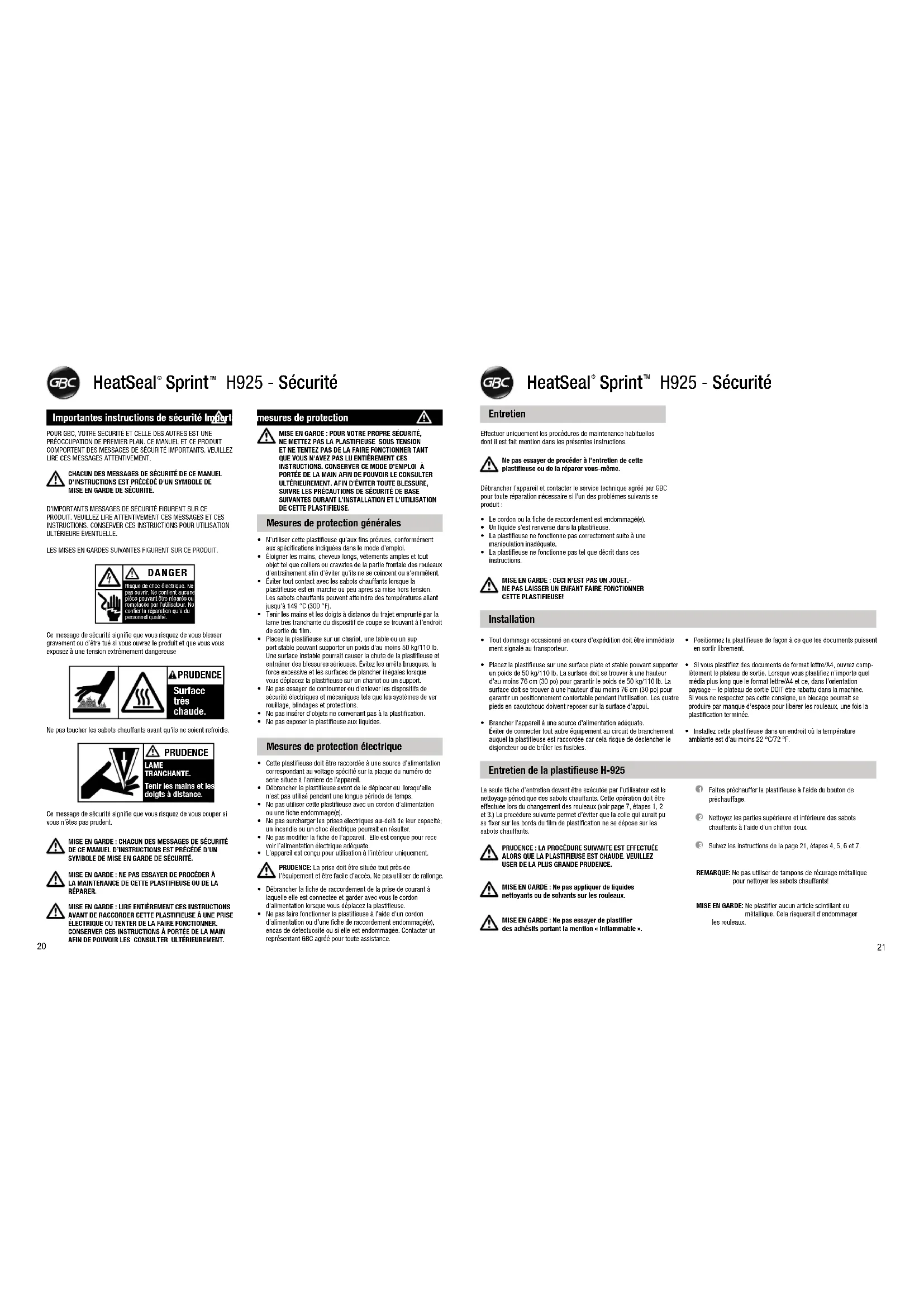 PORTÉE DE LA MAIN AFIN DE POUVOIR LE CONSULTER ULTÉRIEUREMENT. AFIN D’ÉVITER TOUTE BLESSURE, SUIVRE LES PRÉCAUTIONS DE SÉCURITÉ DE BASE SUIVANTES DURANT L’INSTALLATION ET L’UTILISATION DE CETTE PLASTIFIEUSE. PRUDENCE: La prise doit être située tout près de l’équipement et être facile d’accès. Ne pas utiliser de rallonge. Mesures de protection générales Mesures de protection électrique PRUDENCE Surface très chaude. HeatSeal Sprint H925 - Sécurité TM® Effectuer uniquement les procédures de maintenance habituelles dont il est fait mention dans les présentes instructions. Débrancher l’appareil et contacter le service technique agréé par GBC pour toute réparation nécessaire si l’un des problèmes suivants se produit : Entretien Installation Ne pas essayer de procéder à l’entretien de cette plastifieuse ou de la réparer vous-même. MISE EN GARDE : CECI N’EST PAS UN JOUET.- NE PAS LAISSER UN ENFANT FAIRE FONCTIONNER CETTE PLASTIFIEUSE!