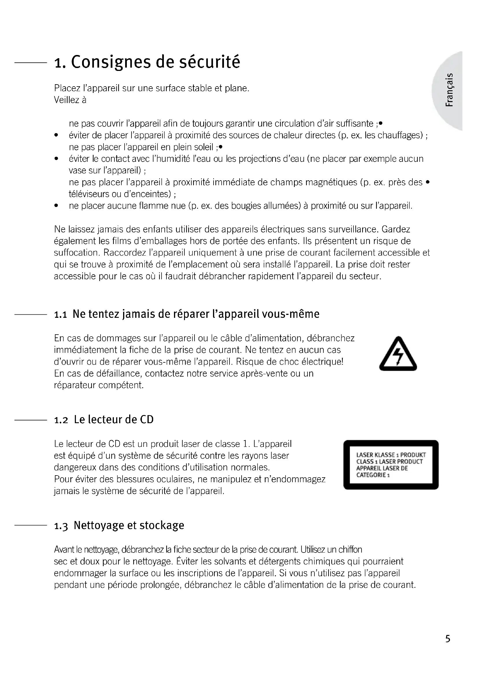 Le lecteur de CD est un produit laser de classe 1. L'appareil est équipé d'un système de sécurité contre les rayons laser dangereux dans des conditions d'utilisation normales. Pour éviter des blessures oculaires, ne manipulez et n'endommagez jamais le système de sécurité de l'appareil.