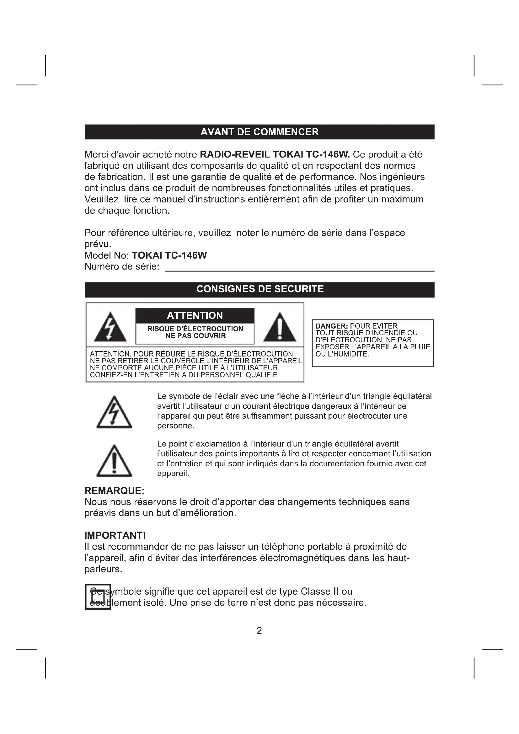 58 BEDIENUNGSANLEITUNG TC-146W TC-146W Français English Dutch Español DeutschAVANT DE COMMENCER Merci d’avoir acheté notre RADIO-REVEIL TOKAI TC-146W. Ce produit a été fabriqué en utilisant des composants de qualité et en respectant des normes de fabrication. Il est une garantie de qualité et de performance. Nos ingénieurs ont inclus dans ce produit de nombreuses fonctionnalités utiles et pratiques. Veuillez lire ce manuel d’instructions entièrement an de proter un maximum de chaque fonction. Pour référence ultérieure, veuillez noter le numéro de série dans l’espace prévu. Model No: TOKAI TC-146W Numéro de série: