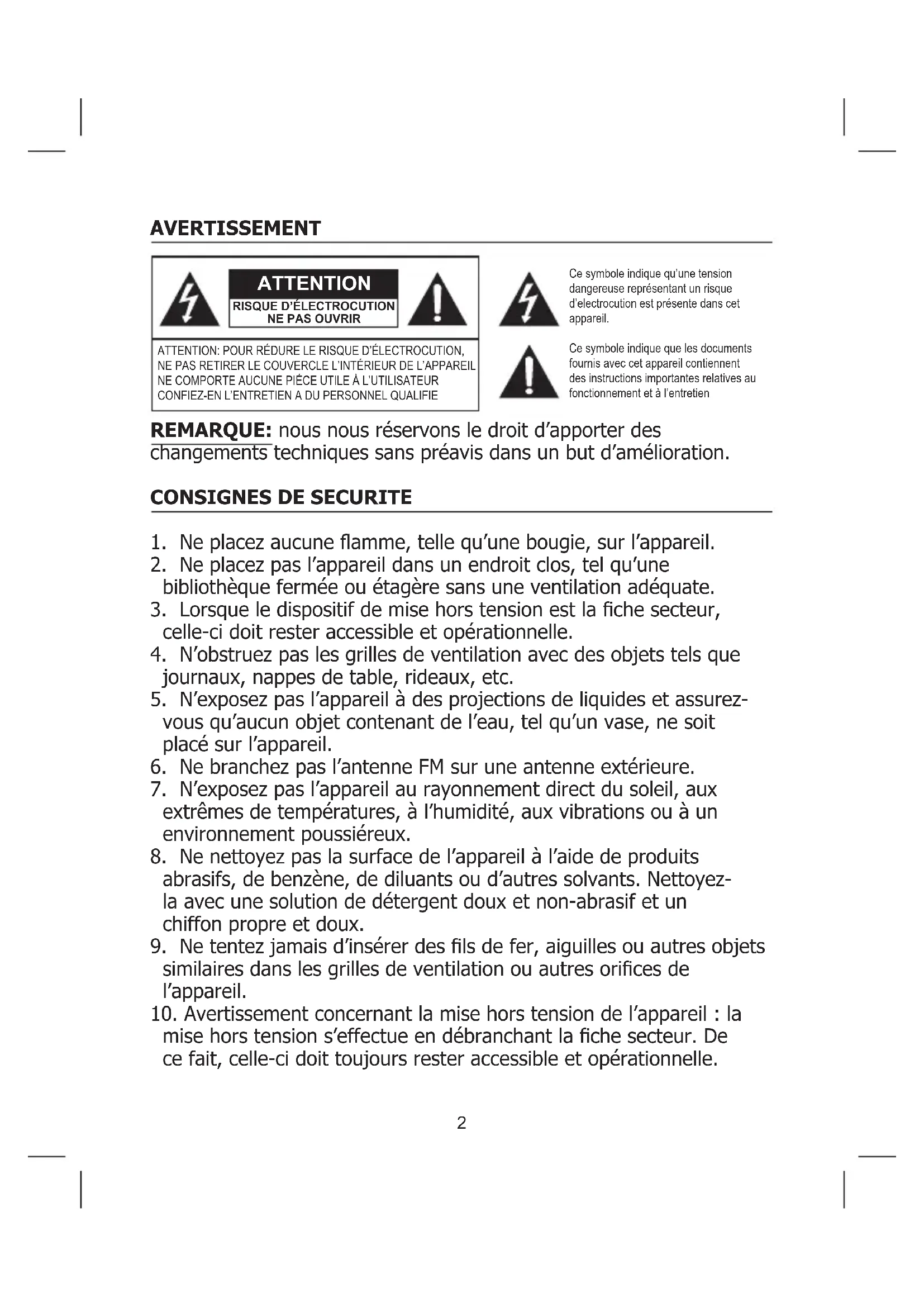 Le fonctionnement normal de l’appareil peut-être gêné par de fortes interférences électromagnétiques dans ce cas réinitialiser l’appareil pour reprendre un fonctionnement normal. Il suft de débrancher le cordon d’alimentation secteur et retirez la batterie de sauvegarde, attendez au moins 3 minutes, puis congurer l’appareil de nouveau en suivant le manuel d’utilisation. Caractéristiques techniques Référence Modèle • TC-132 Alimentation • AC 230 ~ 50 Hz Réserve pour pile de secours • Lithium CR-2032-3V (non fournie) Consommation en mode marche • 5 W Consommation en mode veille • 1 W Puissance de sortie AUDIO • 150MW Fréquence Radio • FM: 87.5MHz - 108 MHz Poids de l’appareil • 0.320 g Dimensions (Lx P x H) • 126 x 120 x 50 mm IMPORTANT : En raison de la révision et de l’amélioration constante quant à la conception de nos produits, les spécications sont sujettes à modication sans préavis. IMPORTATEUR EXCLUSIF Ce produit a été importé par la Société LEMA S.A. Pour toute question relative à la conformité du produit, merci d’envoyer votre demande à : LEMA S.A. 28, Boulevard Zéphirin Camélinat 92230 GENNEVILLIERS FRANCE 8Mise au rebut en n de vie Attention! Ce logo apposé sur le produit indique qu’il s’agit d’un appareil dont le traitement en tant que déchet rentre dans le cadre de la directive 2002/96/CE du 27 janvier 2003, relative aux déchets d’équipements électriques et électroniques (DEEE). Ce symbole signie que les produits électriques et électroniques usagées ne doivent pas être mélangés avec les déchets ménagers généraux. Un système de collecte séparé est prévu pour ces produits. Si vous souhaitez mettre cet appareil au rebut, ne le jetez pas dans une poubelle ordinaire ! - La présence de substances dangereuses dans les équipements électriques et électroniques peut avoir des effets potentiels sur l’environnement et la santé humaine dans le cycle de retraitement de ce produit. - Ainsi, lors de la n de vie de cet appareil, celui-ci ne doit pas être jeté avec les déchets municipaux non triés. Les appareils électriques et électroniques doivent être traités séparément et conformément aux lois en vigueur en matière de traitement, de récupération et de recyclage adéquats de ces appareils. - Des systèmes de reprise et de collecte sont mis à votre disposition par les collectivités locales (déchetteries) et les distributeurs. Veuillez contacter votre administration locale pour plus de renseignements. Vous avez l’obligation d’utiliser les systèmes de collecte sélective mise à votre disposition. - Si votre appareil électrique et électronique usagé comporte des piles ou des accumulateurs, veuillez les mettre séparément et préalablement au rebut conformément à la législation locale en vigueur. - En veillant à la mise au rebut correcte de ce produit, vous contribuerez à assurer le traitement, la récupération et le recyclage nécessaires de ces déchets, et préviendrez ainsi les effets néfastes potentiels de leur mauvaise gestion sur l’environnement et la santé humaine. Cet appareil est conforme aux exigences imposées par la Directive Européenne 2006 / 95 CE (Directives sur la Compatibilité Electromagnétique et Basse Tension) 9WARNING The lightning ash is intended to alert the user to the presence of dangerous voltage within the product’s enclosure, and touching the inner parts may result in a risk of electric shock to persons. The exclamatory mark is intended to alert the user to the presence of important operating instructions. To reduce the risk of electric shock or re, do not open the cover. Refer servicing to qualied service personnel. NOTE: We reserve the right to make technical changes without notice in the interest of improvement.
