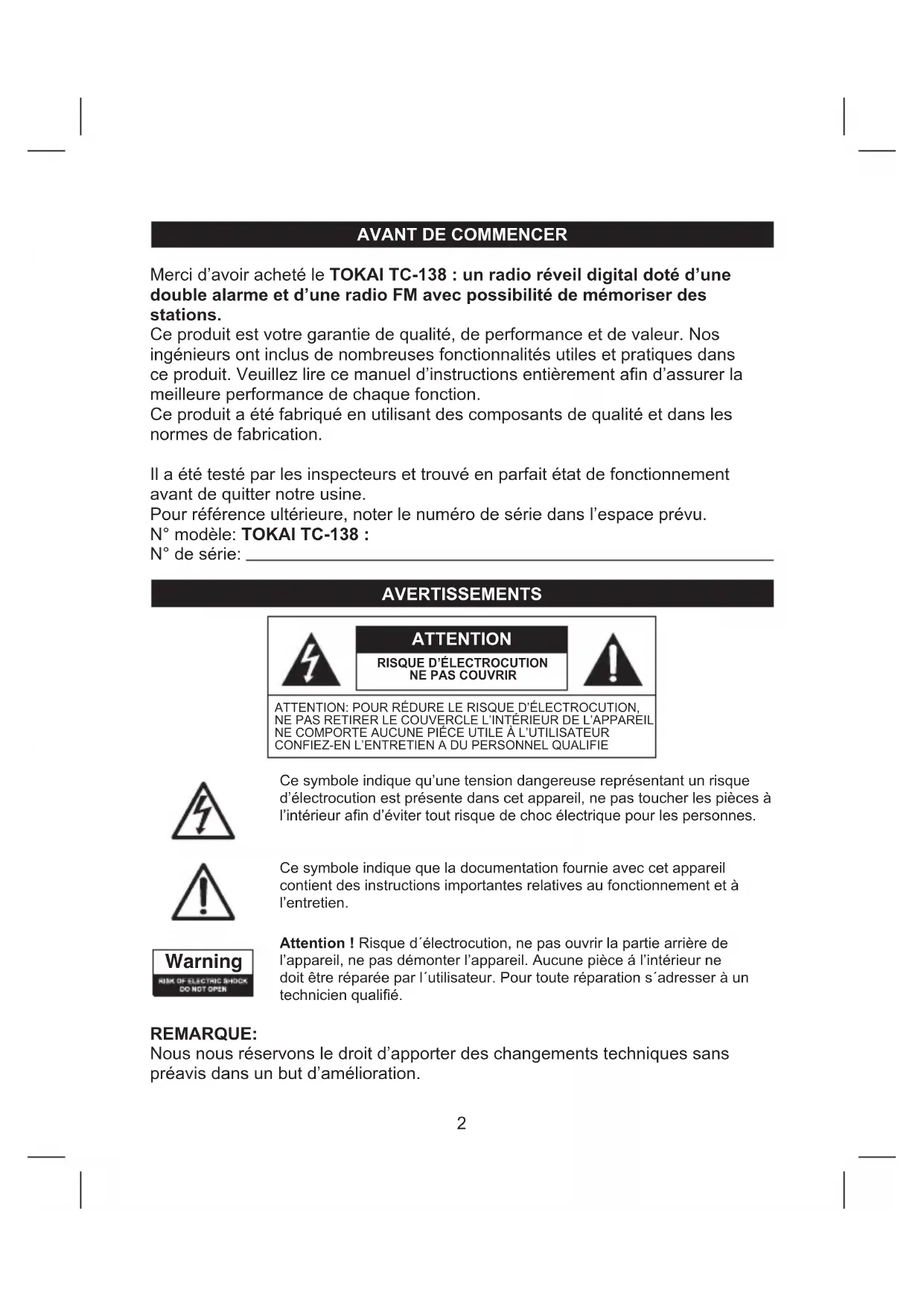 Merci d’avoir acheté le TOKAI TC-138 : un radio réveil digital doté d’une double alarme et d’une radio FM avec possibilité de mémoriser des stations. Ce produit est votre garantie de qualité, de performance et de valeur. Nos ingénieurs ont inclus de nombreuses fonctionnalités utiles et pratiques dans ce produit. Veuillez lire ce manuel d’instructions entièrement an d’assurer la meilleure performance de chaque fonction. Ce produit a été fabriqué en utilisant des composants de qualité et dans les normes de fabrication. Il a été testé par les inspecteurs et trouvé en parfait état de fonctionnement avant de quitter notre usine. Pour référence ultérieure, noter le numéro de série dans l’espace prévu. N° modèle: TOKAI TC-138 : N° de série: AVERTISSEMENTS REMARQUE: Nous nous réservons le droit d’apporter des changements techniques sans préavis dans un but d’amélioration.