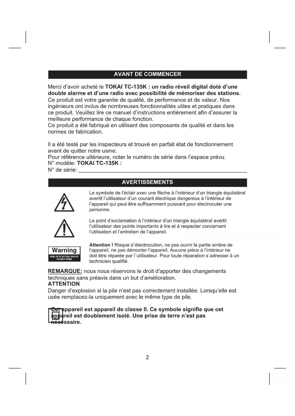 Merci d’avoir acheté le TOKAI TC-135K : un radio réveil digital doté d’une double alarme et d’une radio avec possibilité de mémoriser des stations. Ce produit est votre garantie de qualité, de performance et de valeur. Nos ingénieurs ont inclus de nombreuses fonctionnalités utiles et pratiques dans ce produit. Veuillez lire ce manuel d’instructions entièrement an d’assurer la meilleure performance de chaque fonction. Ce produit a été fabriqué en utilisant des composants de qualité et dans les normes de fabrication. Il a été testé par les inspecteurs et trouvé en parfait état de fonctionnement avant de quitter notre usine. Pour référence ultérieure, noter le numéro de série dans l’espace prévu. N° modèle: TOKAI TC-135K : N° de série: AVERTISSEMENTS REMARQUE: nous nous réservons le droit d’apporter des changements techniques sans préavis dans un but d’amélioration. ATTENTION Danger d’explosion si la pile n’est pas correctement installée. Lorsqu’elle est usée remplacez-la uniquement avec le même type de pile. Cet appareil est appareil de classe II. Ce symbole signie que cet appareil est doublement isolé. Une prise de terre n’est pas nécessaire.