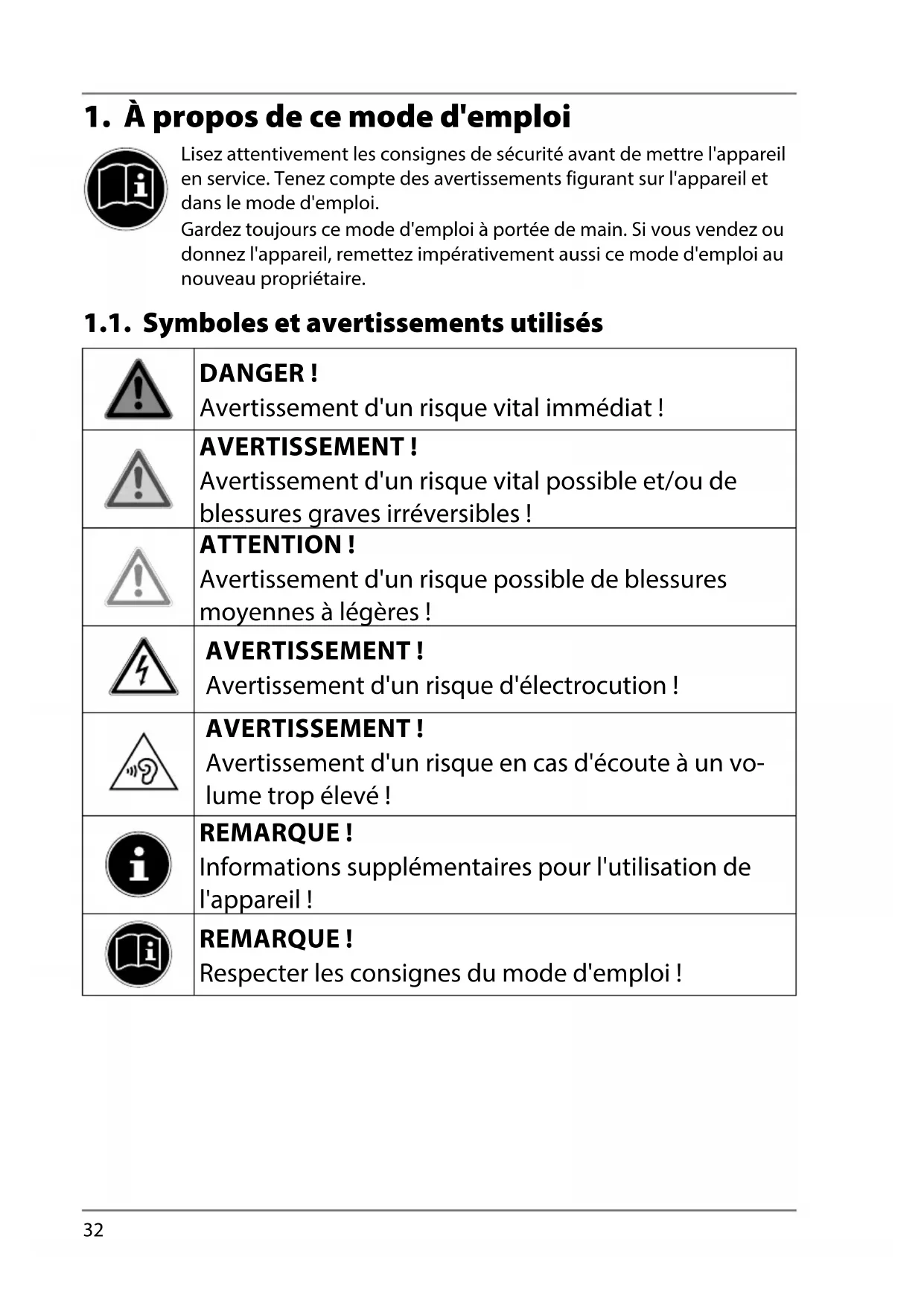 Lisez attentivement les consignes de sécurité avant de mettre l'appareil en service. Tenez compte des avertissements figurant sur l'appareil et dans le mode d'emploi. Gardez toujours ce mode d'emploi à portée de main. Si vous vendez ou donnez l'appareil, remettez impérativement aussi ce mode d'emploi au nouveau propriétaire. 1.1. Symboles et avertissements utilisés DANGER! Avertissement d'un risque vital immédiat ! AVERTISSEMENT ! Avertissement d'un risque vital possible et/ou de blessures graves irréversibles ! ATTENTION ! Avertissement d'un risque possible de blessures moyennes à légères! AVERTISSEMENT ! Avertissement d'un risque d'électrocution ! AVERTISSEMENT ! Avertissement d'un risque en cas d'écoute à un vo- lume trop élevé ! REMARQUE ! Informations supplémentaires pour l'utilisation de l'appareil ! REMARQUE ! Respecter les consignes du mode d'emploi !33
