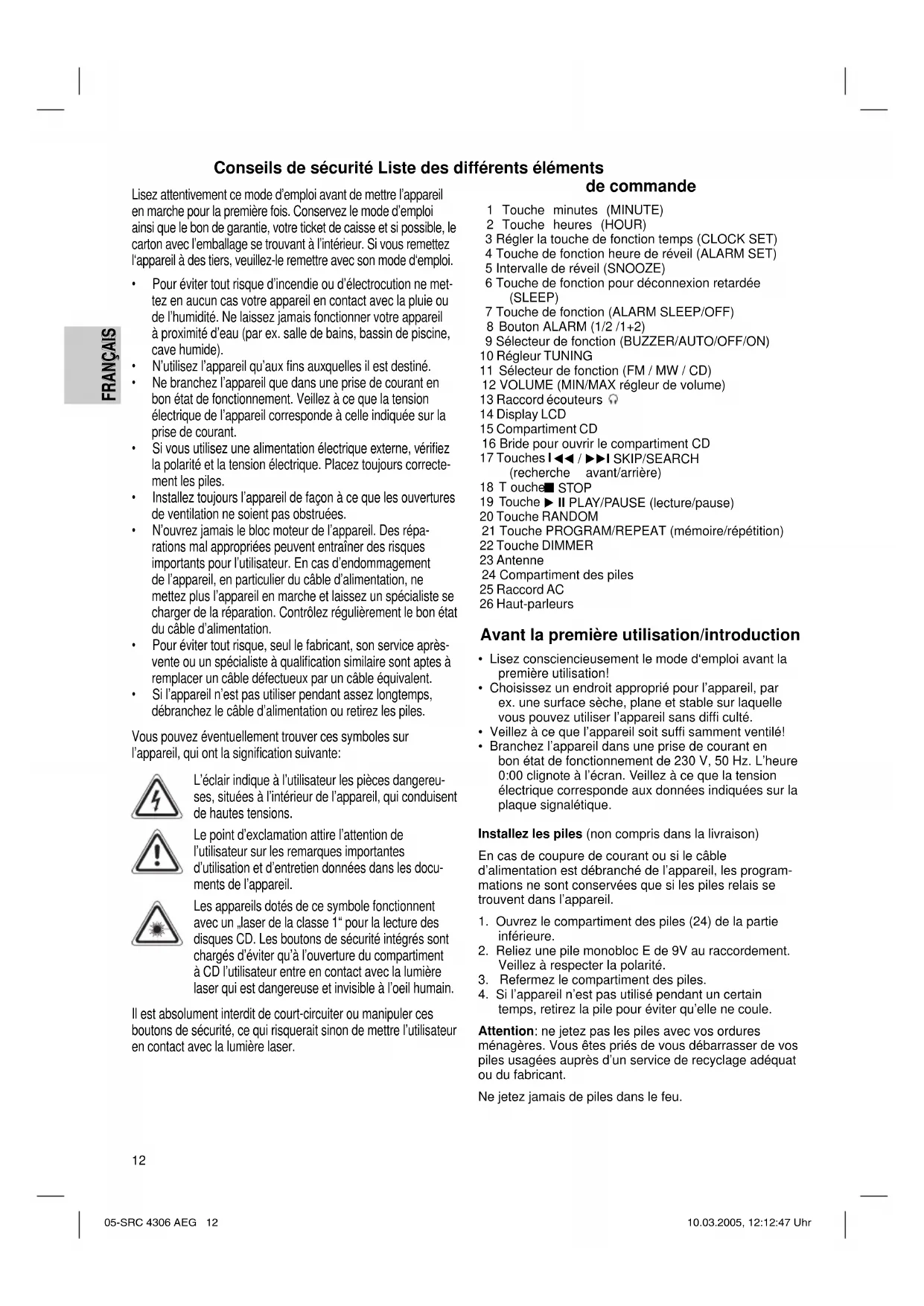 temps, retirez la pile pour éviter qu’elle ne coule. Attention: ne jetez pas les piles avec vos ordures ménagères. Vous êtes priés de vous débarrasser de vos piles usagées auprès d’un service de recyclage adéquat ou du fabricant. Ne jetez jamais de piles dans le feu. 05-SRC 4306 AEG 12 10.03.2005, 12:12:47 Uhr Lisez attentivement ce mode d’emploi avant de mettre l’appareil en marche pour la première fois. Conservez le mode d’emploi ainsi que le bon de garantie, votre ticket de caisse et si possible, le carton avec l’emballage se trouvant à l’intérieur. Si vous remettez l‘appareil à des tiers, veuillez-le remettre avec son mode d‘emploi.